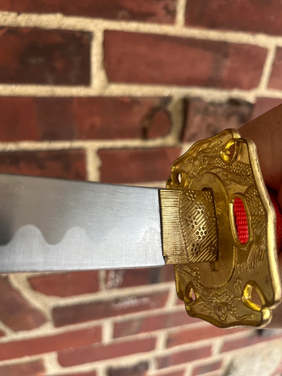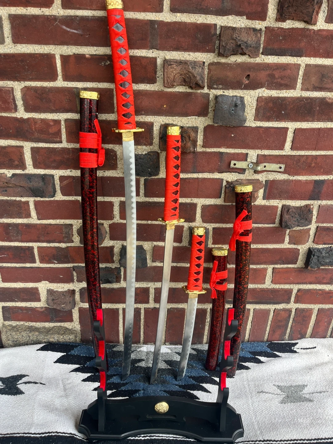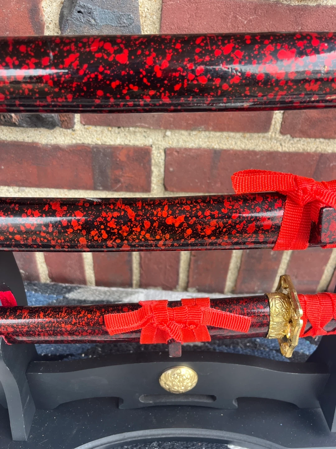 This set includes three decorative katana swords in varying sizes. They feature red-wrapped handles and ornate gold-colored tsubas with dragon designs. The scabbards are hot lava . A black display stand is also included.