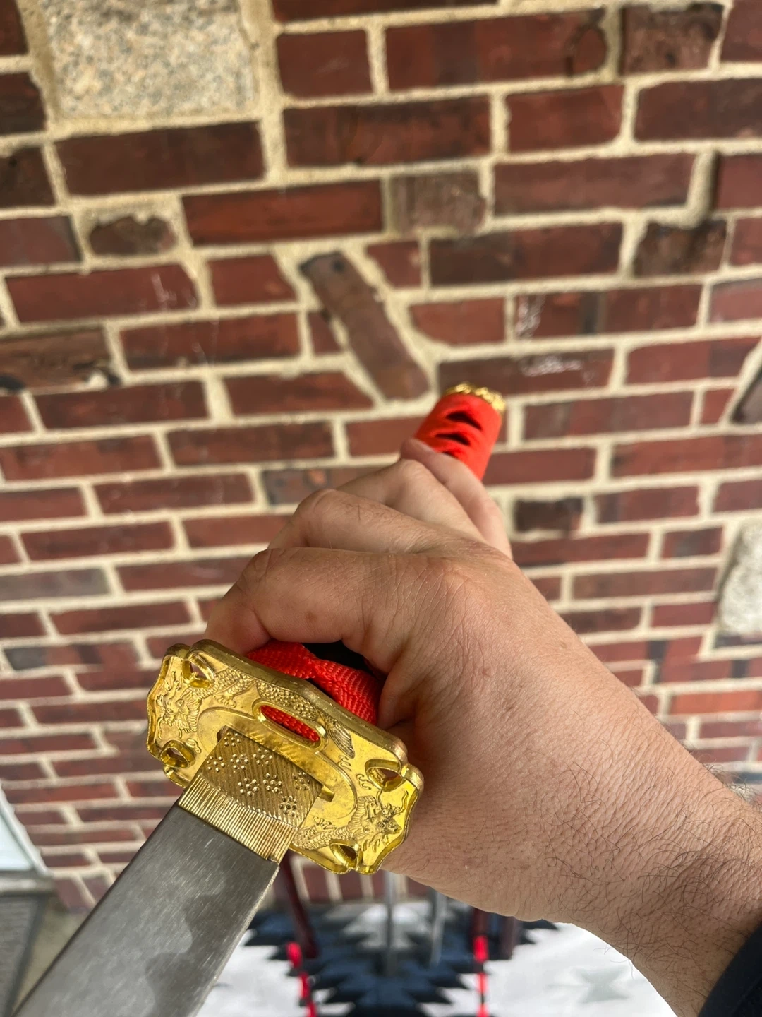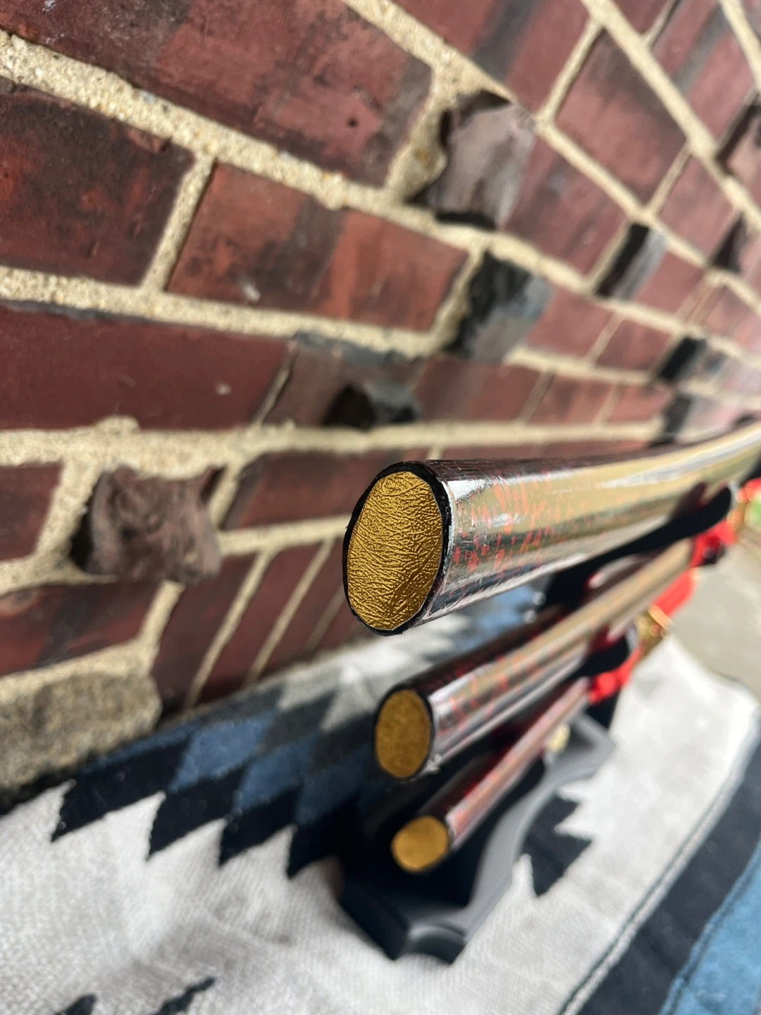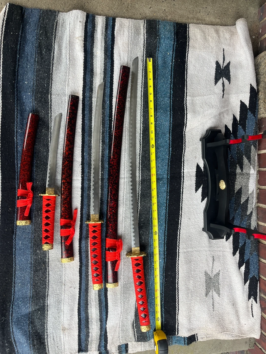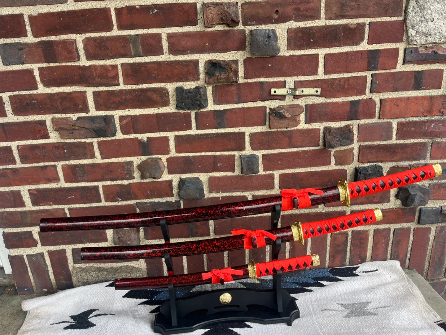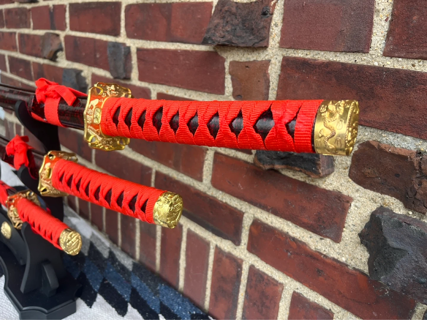 This set includes three decorative katana swords in varying sizes. They feature red-wrapped handles and ornate gold-colored tsubas with dragon designs. The scabbards are hot lava . A black display stand is also included.