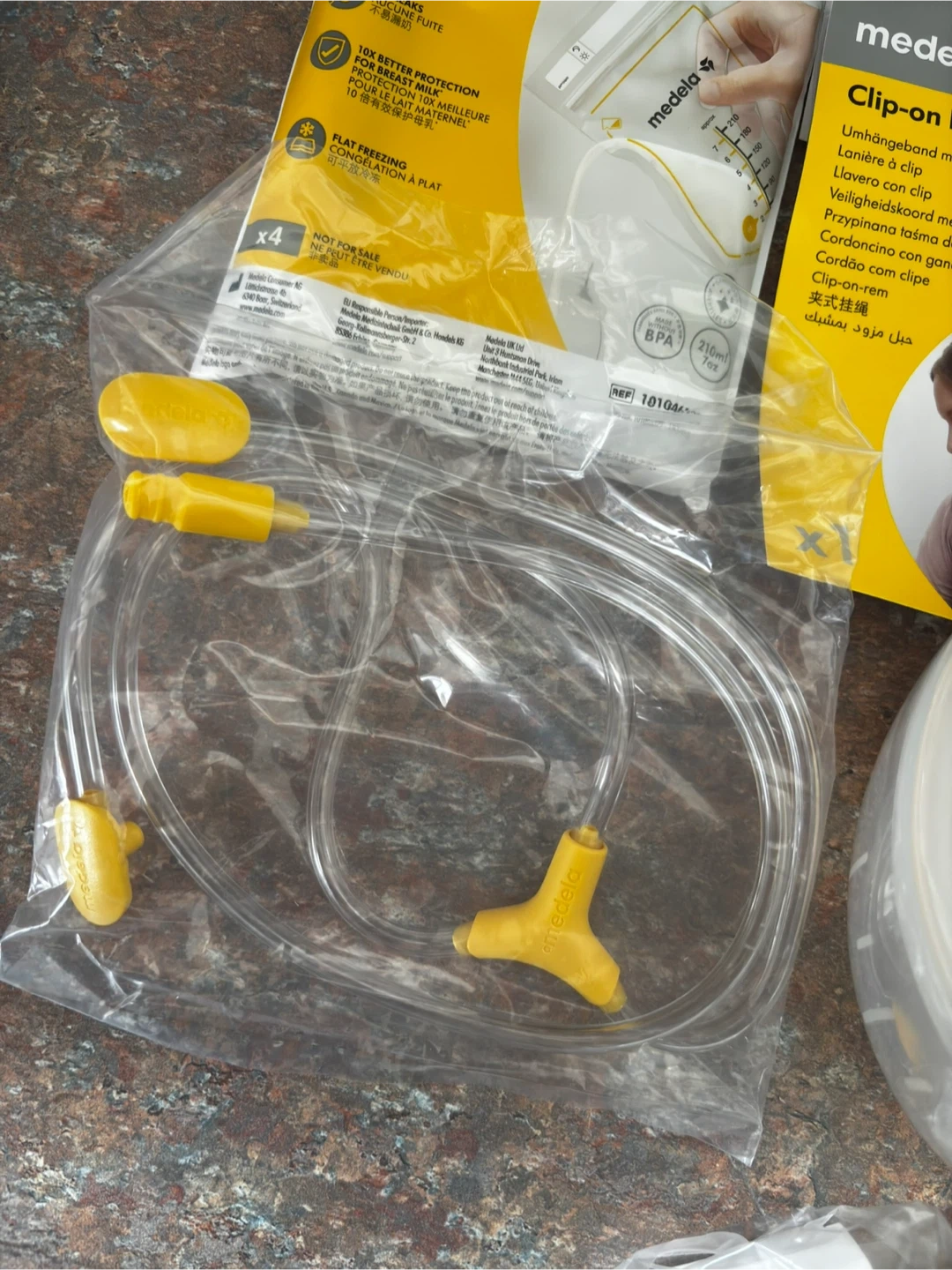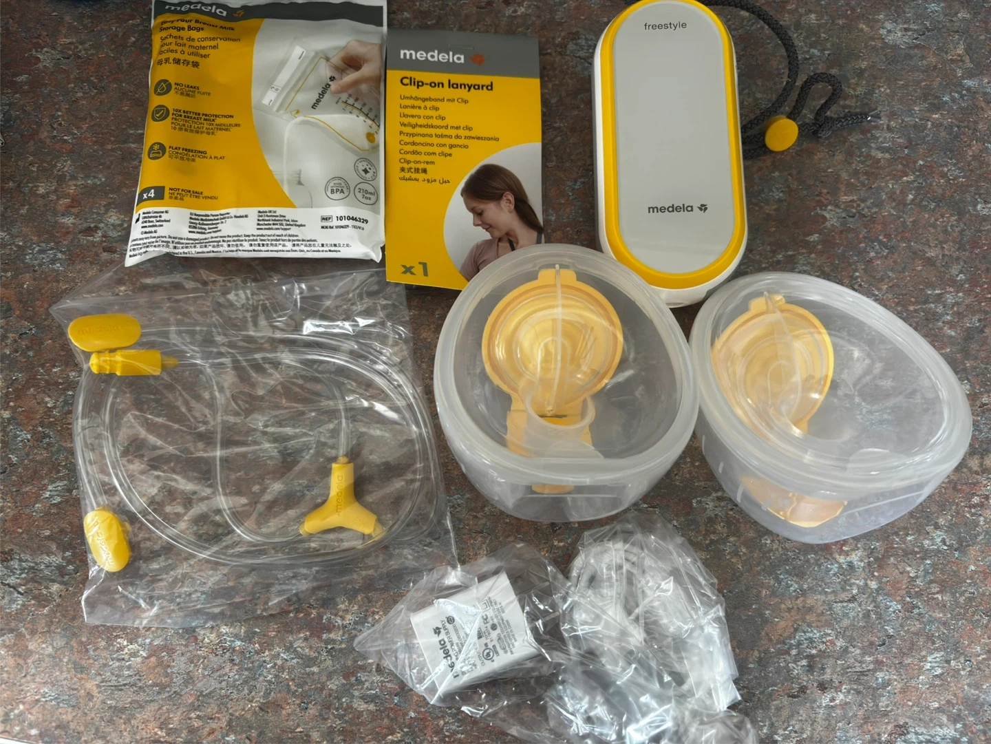 Medela Freestyle breast pump kit with double electric pump and accessories. Includes breast pump unit, tubing, two breast shields, and milk storage bags. These storage bags offer 10x better protection for freezing breast milk.