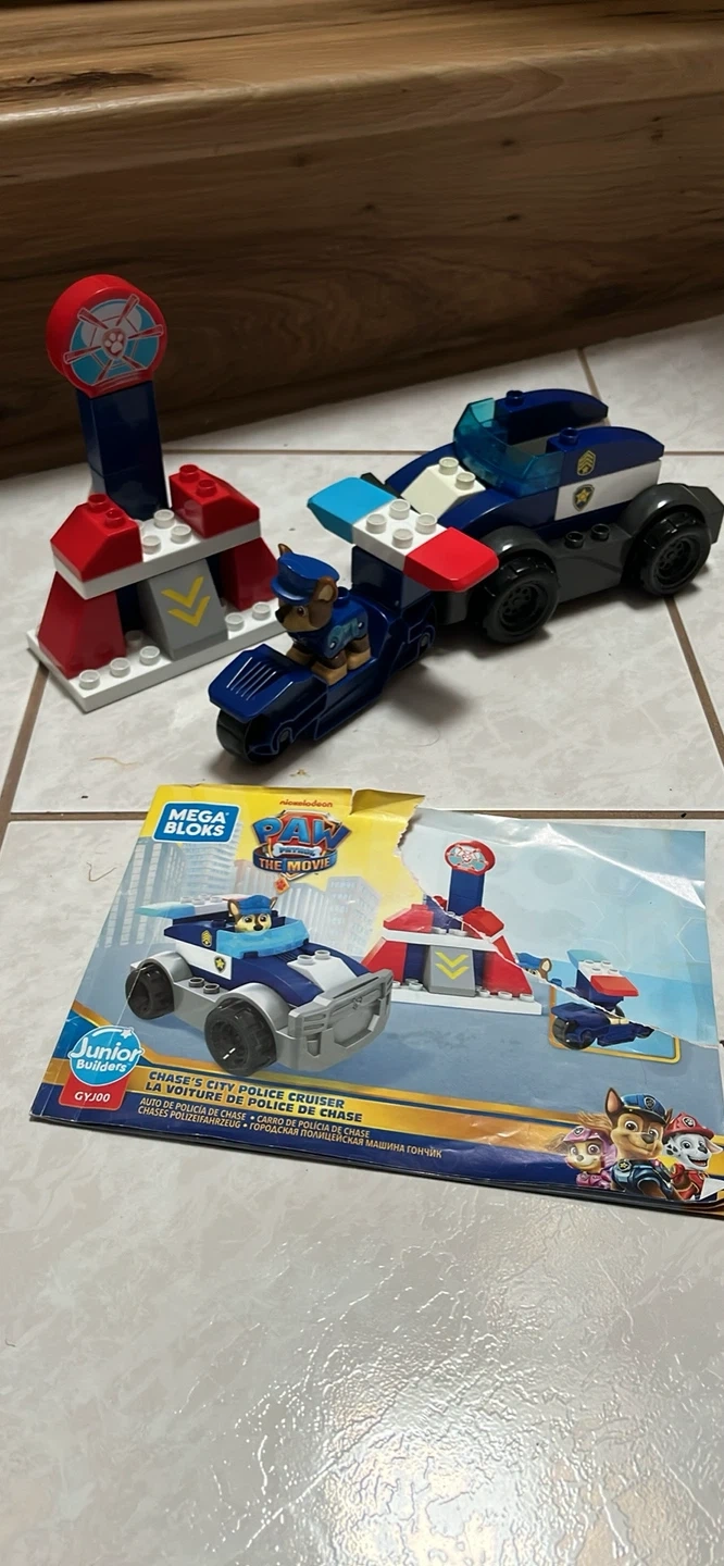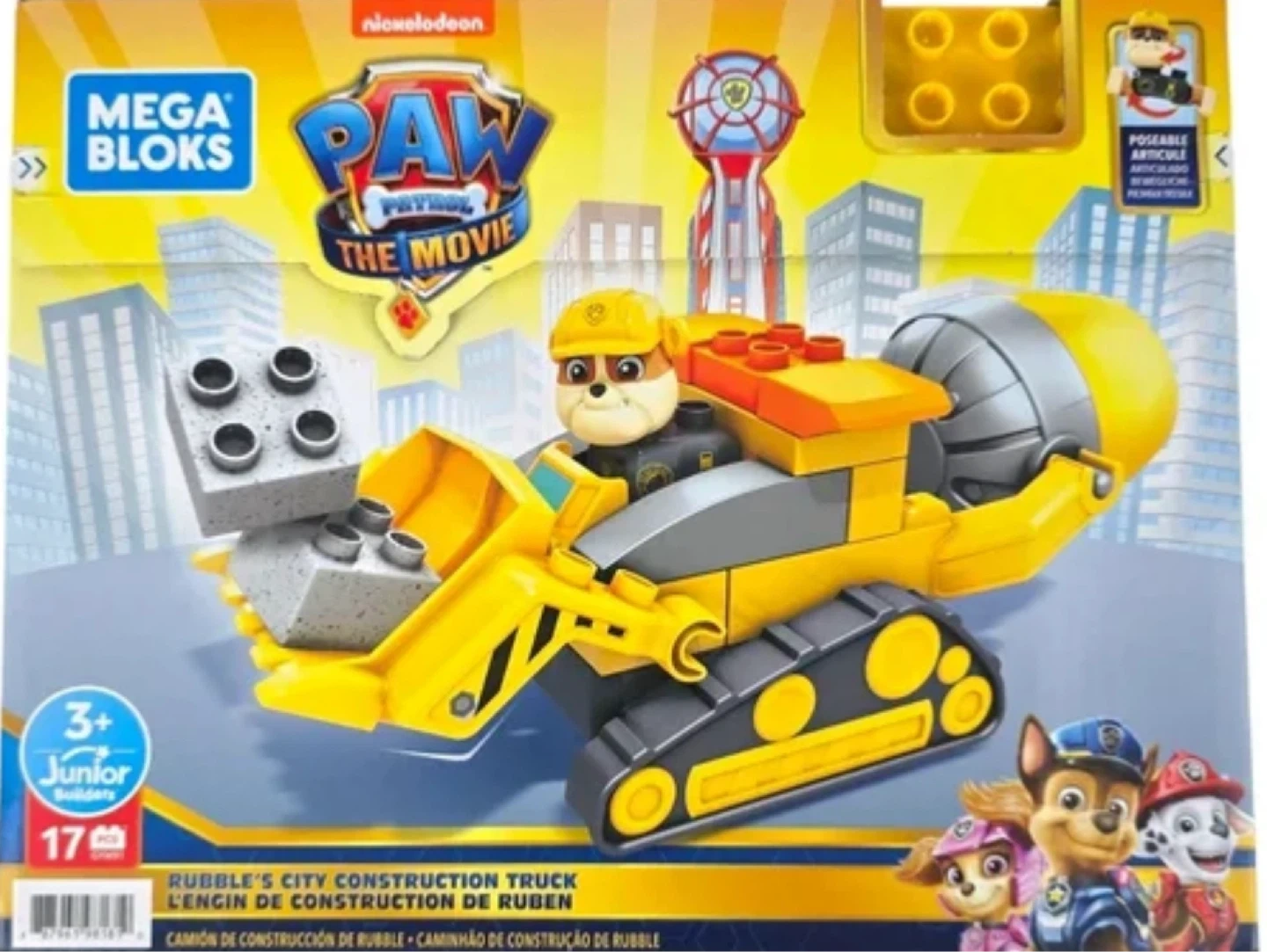 This Mega Bloks Junior set features Rubble's City Construction Truck from Paw Patrol: The Movie. It's designed for ages 3 and up, offering a fun building experience. Includes all visible pieces from the construction set.