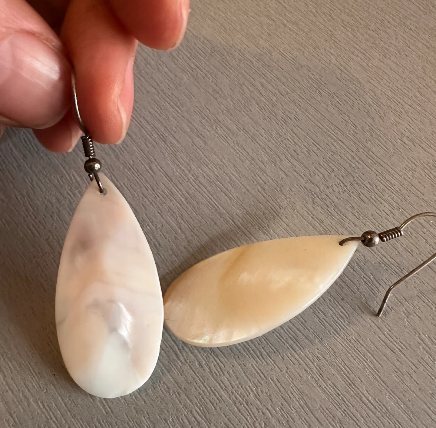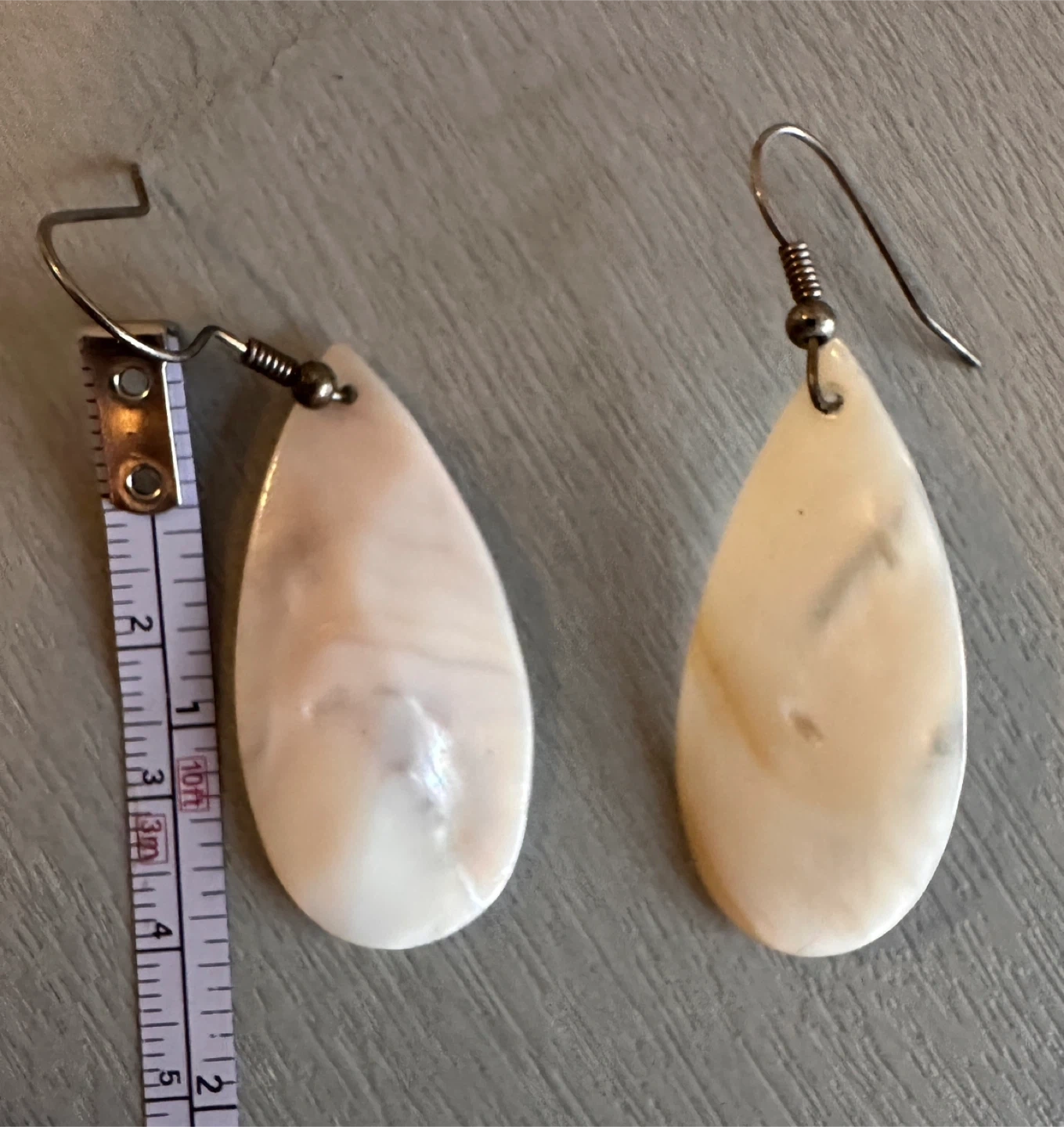 Selling a pair of lovely teardrop earrings made of mother of pearl, with a beautiful iridescent sheen. The earrings are in great condition and would make a wonderful addition to any jewelry collection