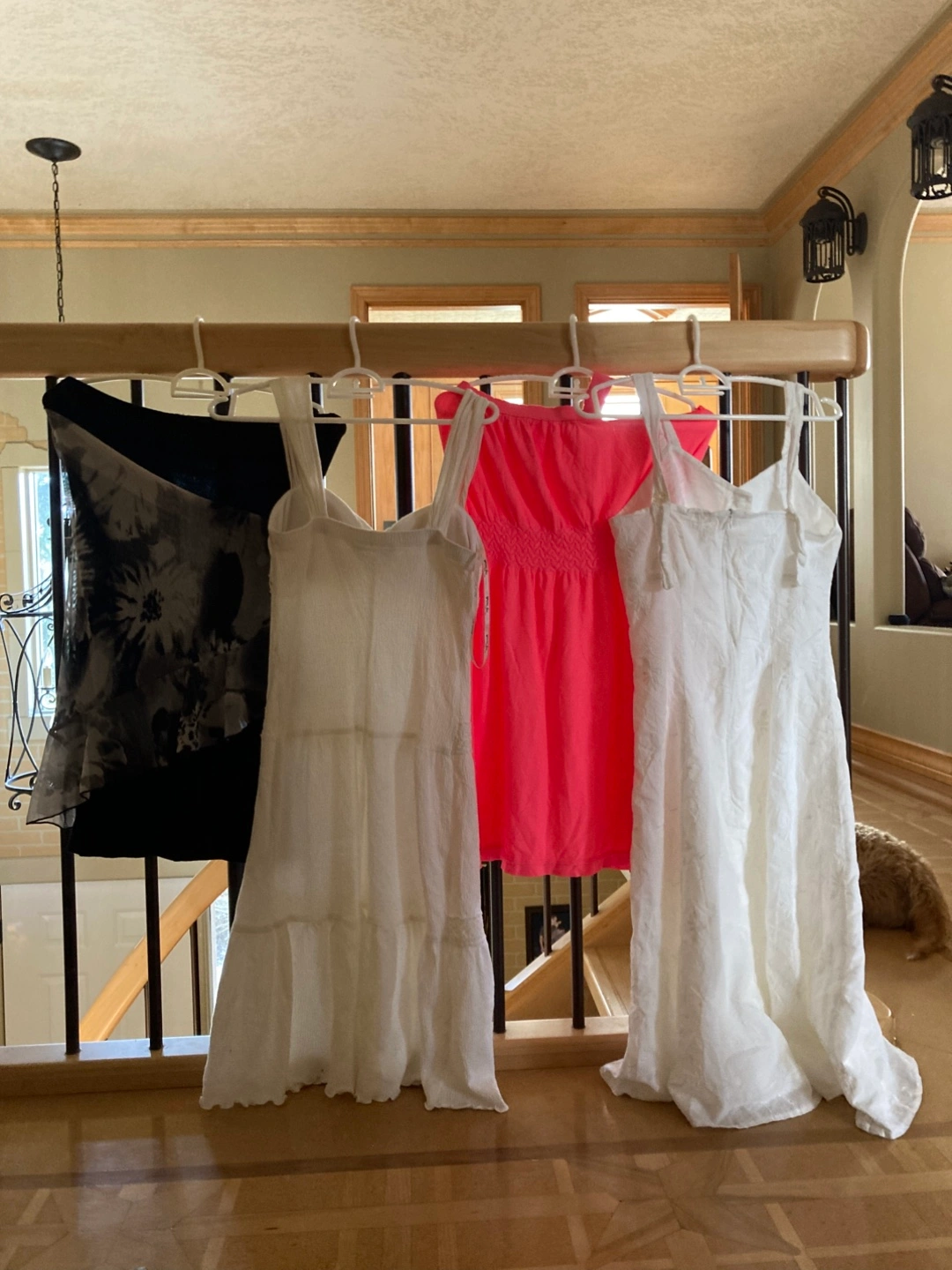 Offering a collection of dresses in various styles, length and colours. One black dress featuring a floral print, two white dresses, and a bright pink dress. These dresses would be perfect for a relaxing summer day. Easy to wash, fast to dry, non wrinkled. Each $12 or all for $40.