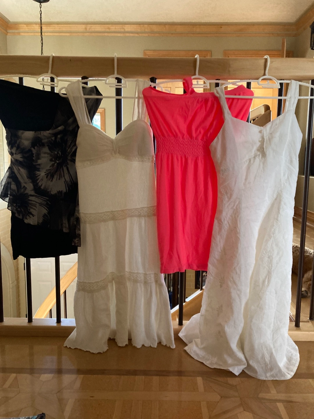 Offering a collection of dresses in various styles, length and colours. One black dress featuring a floral print, two white dresses, and a bright pink dress. These dresses would be perfect for a relaxing summer day. Easy to wash, fast to dry, non wrinkled. Each $12 or all for $40.