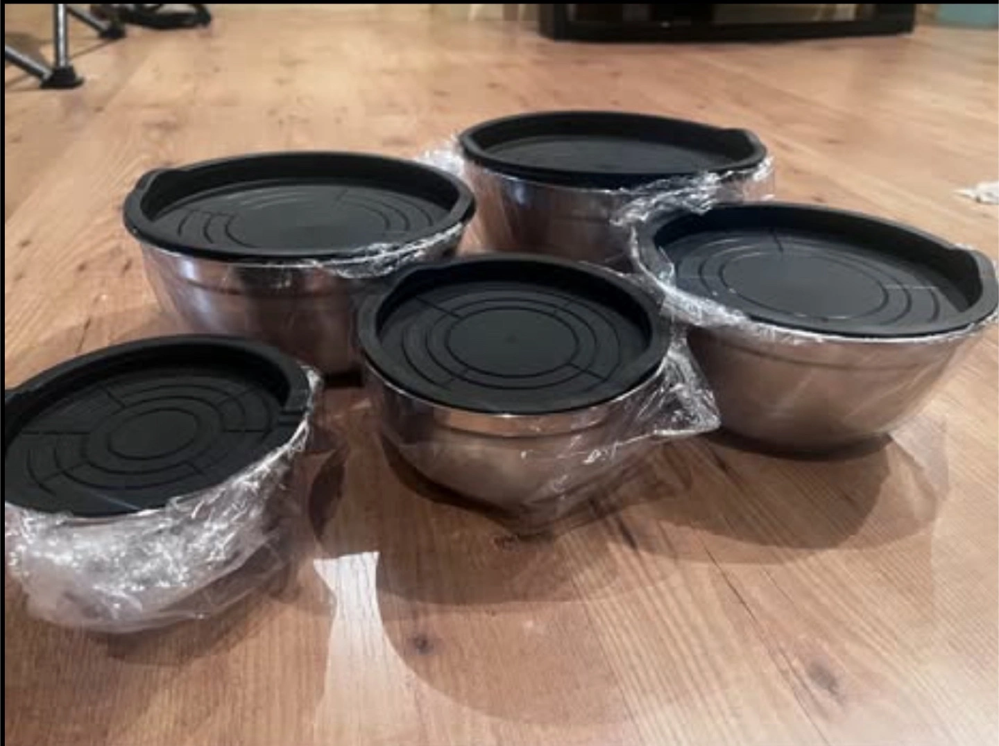 I'm selling a set of 5 stainless steel mixing bowls, each with its own black lid. They're in great shape and ready for a new home! Perfect for all your cooking and baking needs