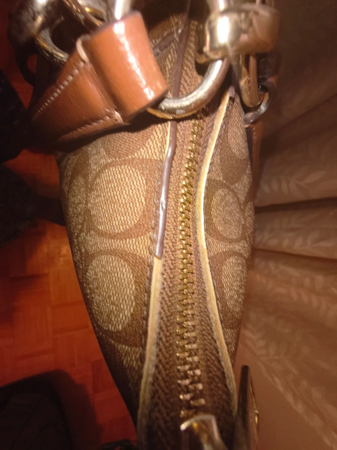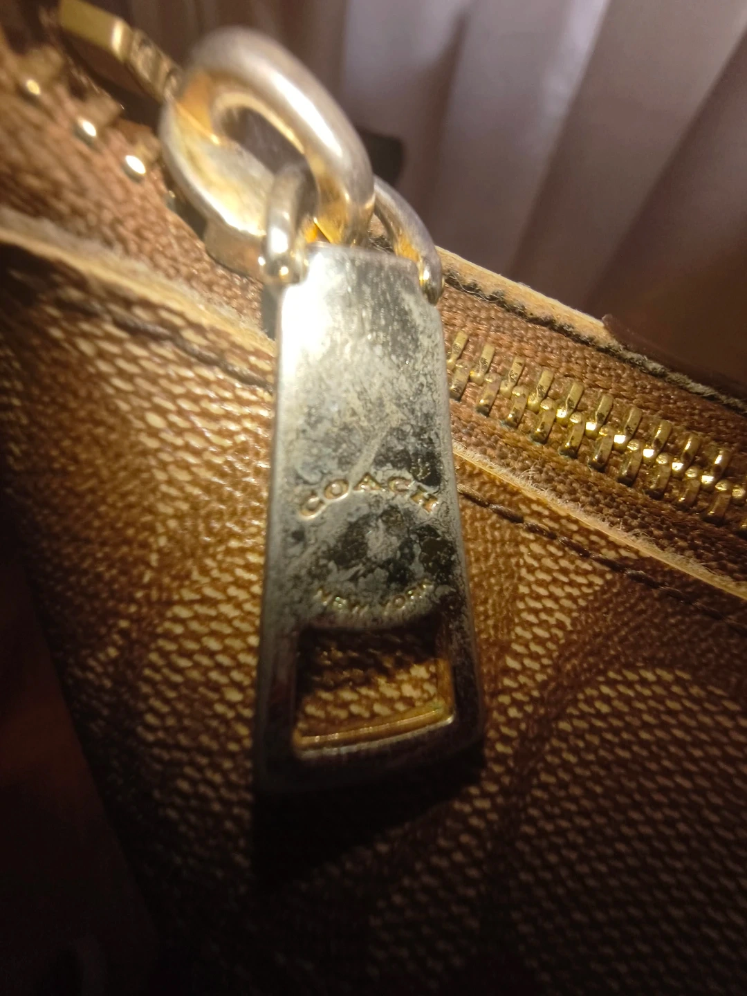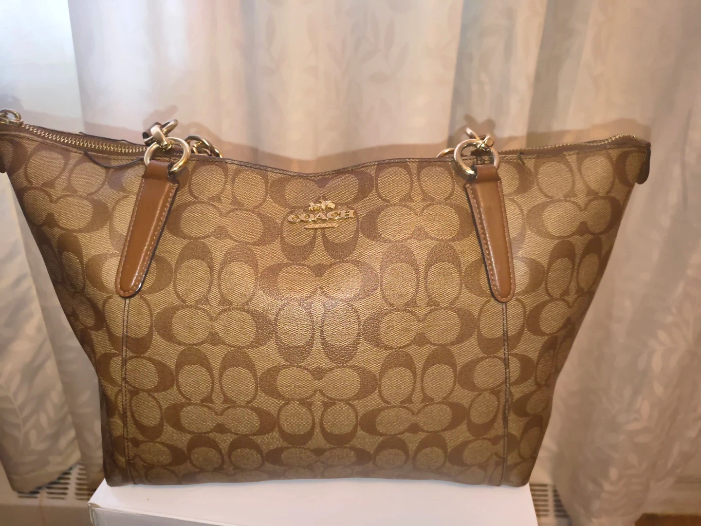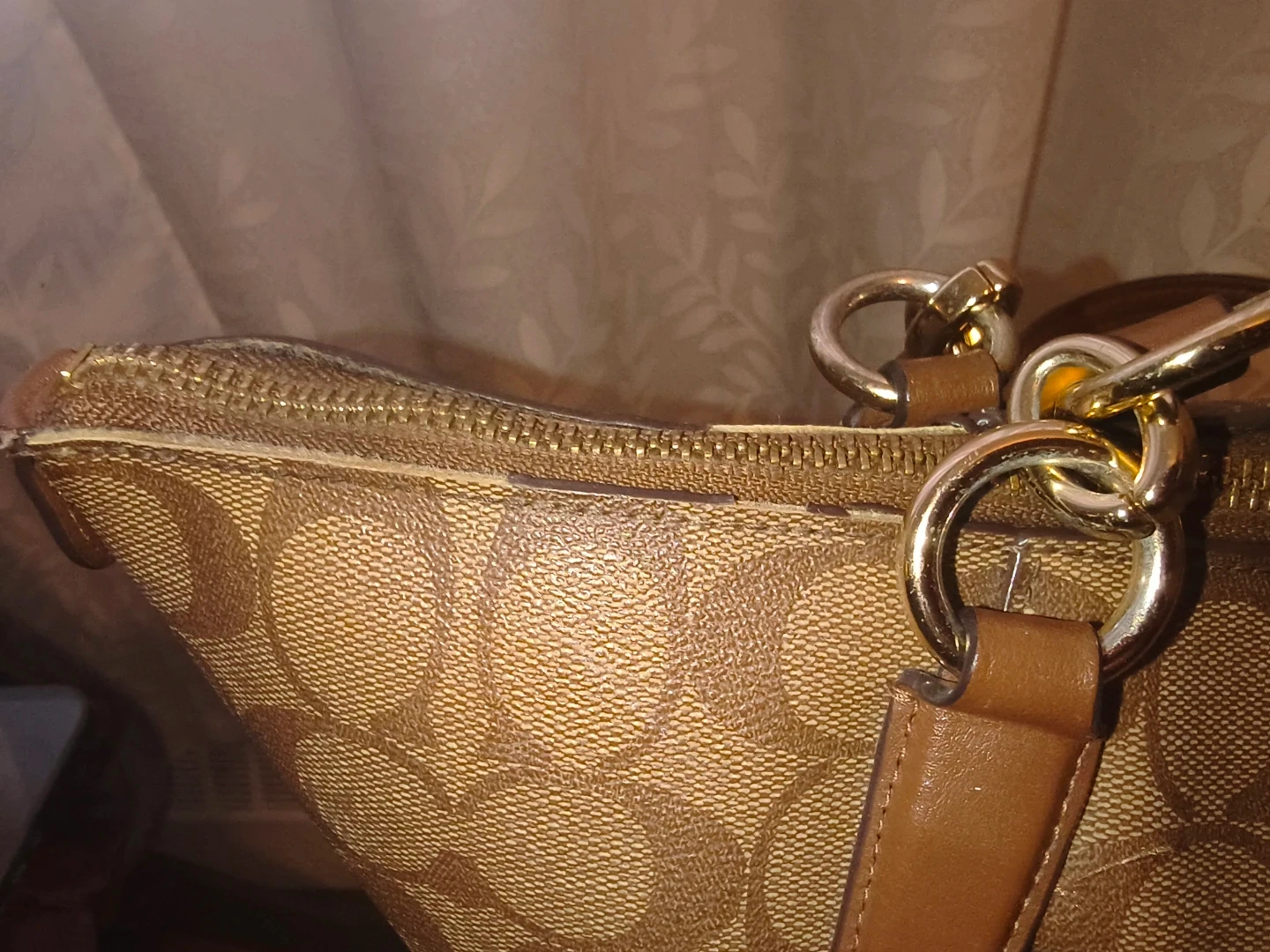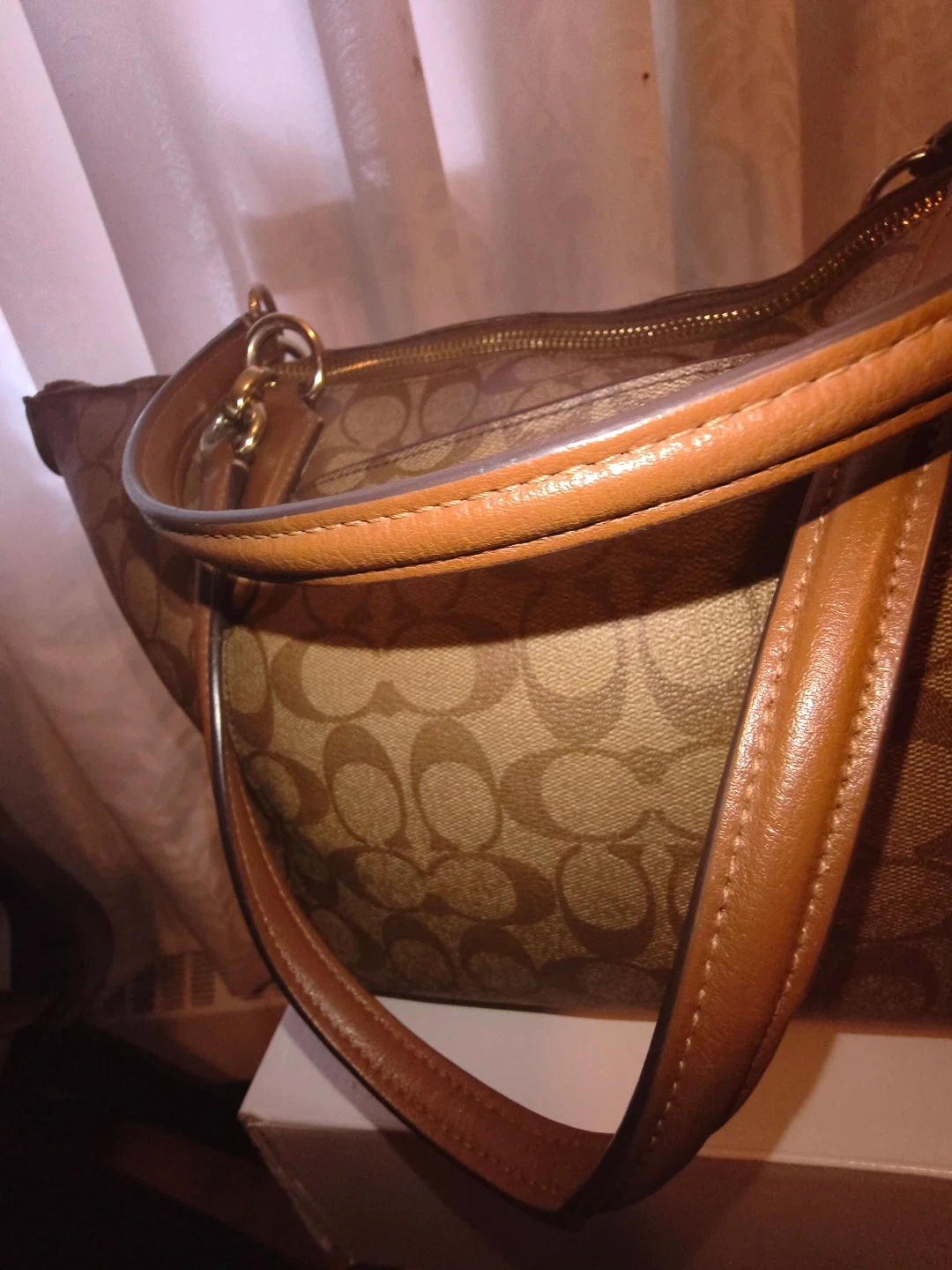 This Coach tote bag features the classic monogram pattern. It has leather trim and gold-tone hardware. A zip top closure keeps your belongings secure.