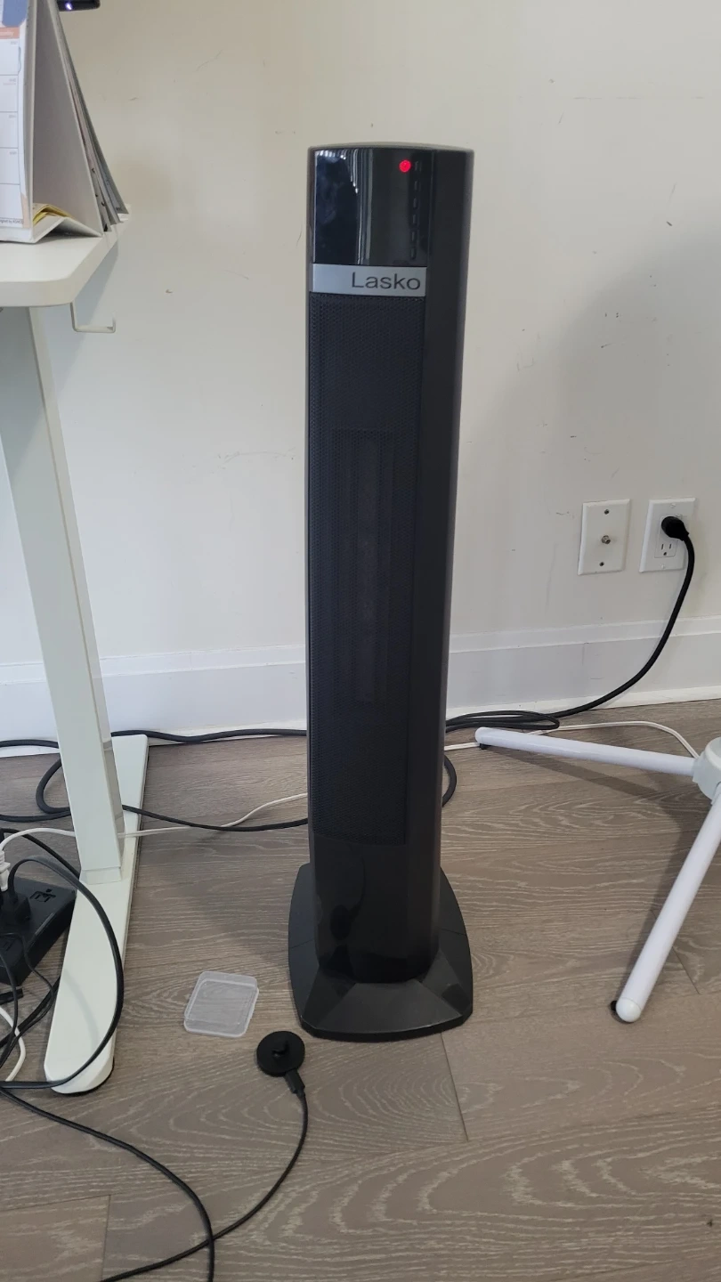 This is a Lasko ceramic tower heater. It's black and has a narrow design. This heater is great for quickly warming up a room. It has a red indicator light to show it's on.
