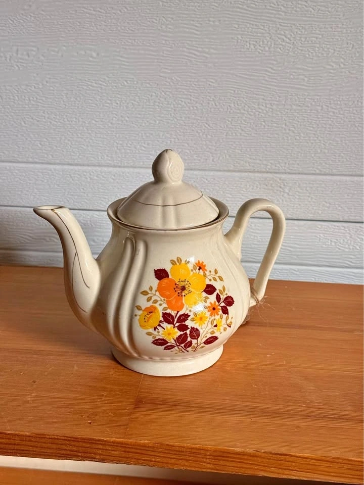 Charming FESTIVAL stoneware petite teapot with a pretty floral design in yellow, orange, and brown on a creamy off-white color. Great for tea or as a cute decor piece.