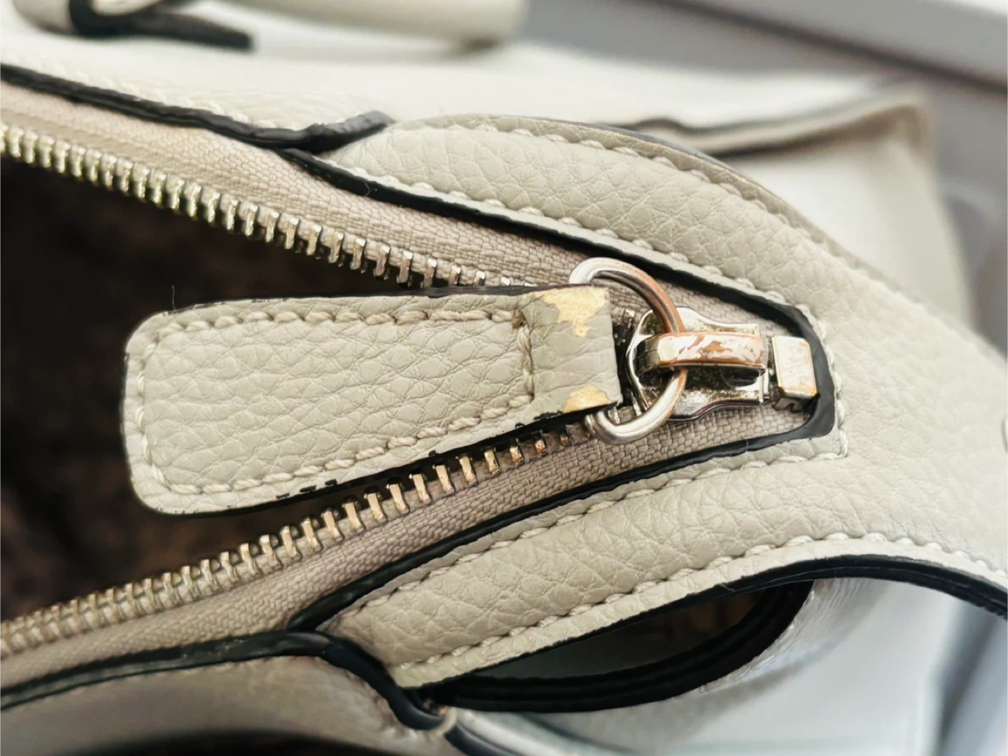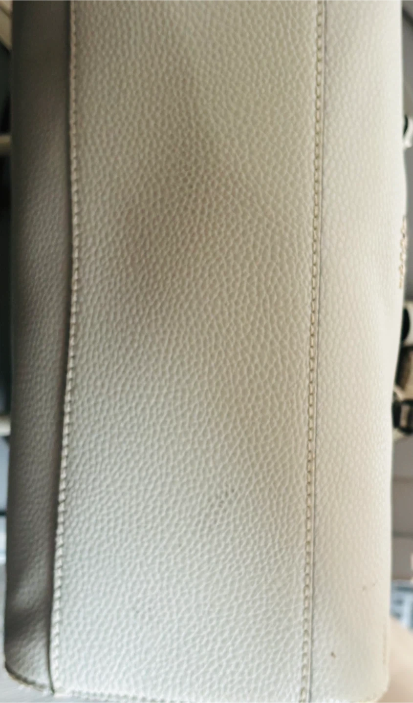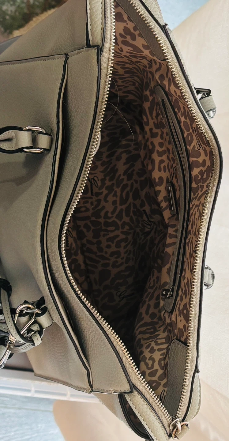 This light grey Guess tote bag is made of faux leather. It features a zippered closure and a leopard print interior. The bag has tassels and silver hardware.
