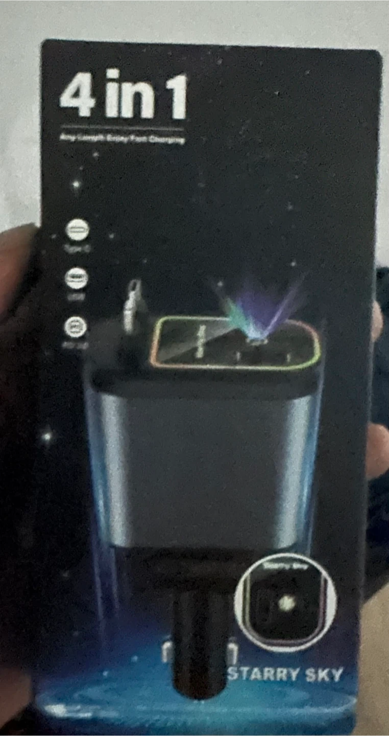 Selling a 4 in 1 charger! It features Any Length Enjoy Fast Charging. It has an intelligent display, USB, and Type-C. It also has output Type-C & IOS and is a universal car charger