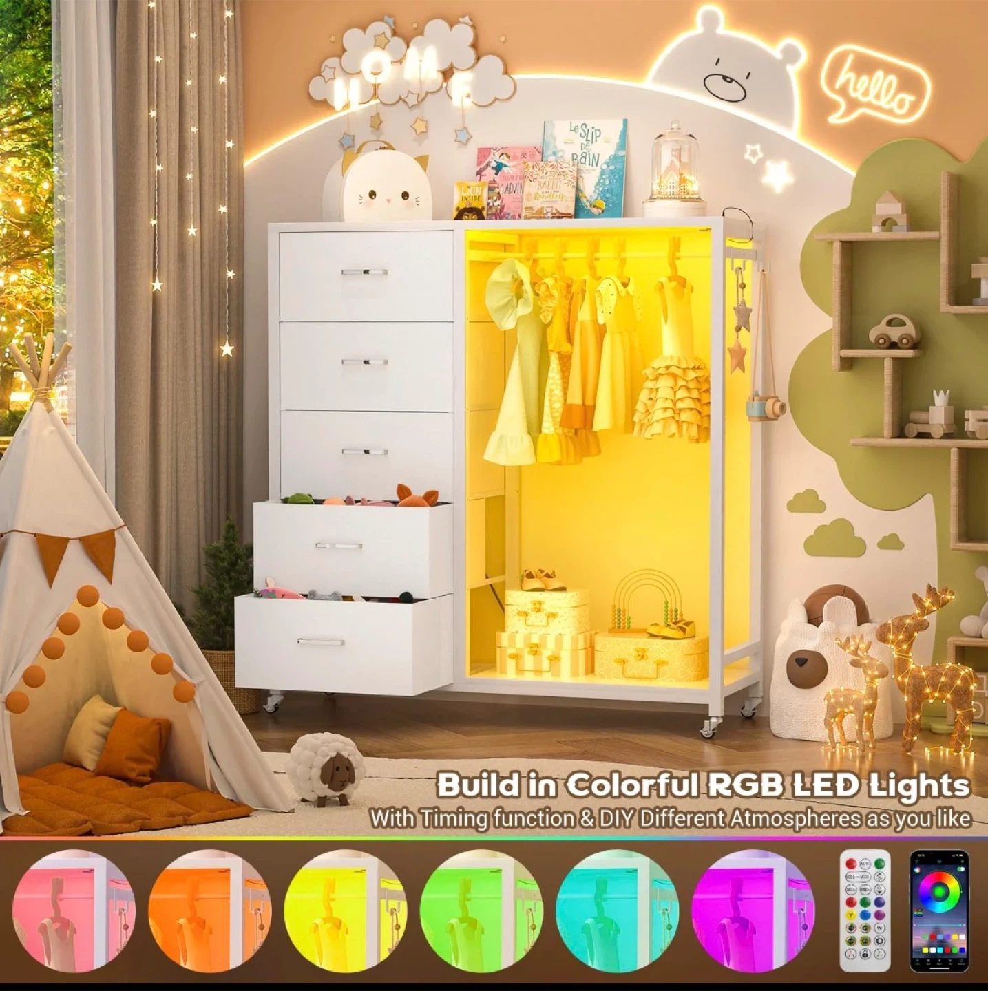 This is a white wardrobe closet with five spacious drawers! It also has a built-in colourful RGB LED light with timing function and DIY different atmospheres as you like. The wardrobe also features a spacious desktop, convenient hooks, and lockable wheels