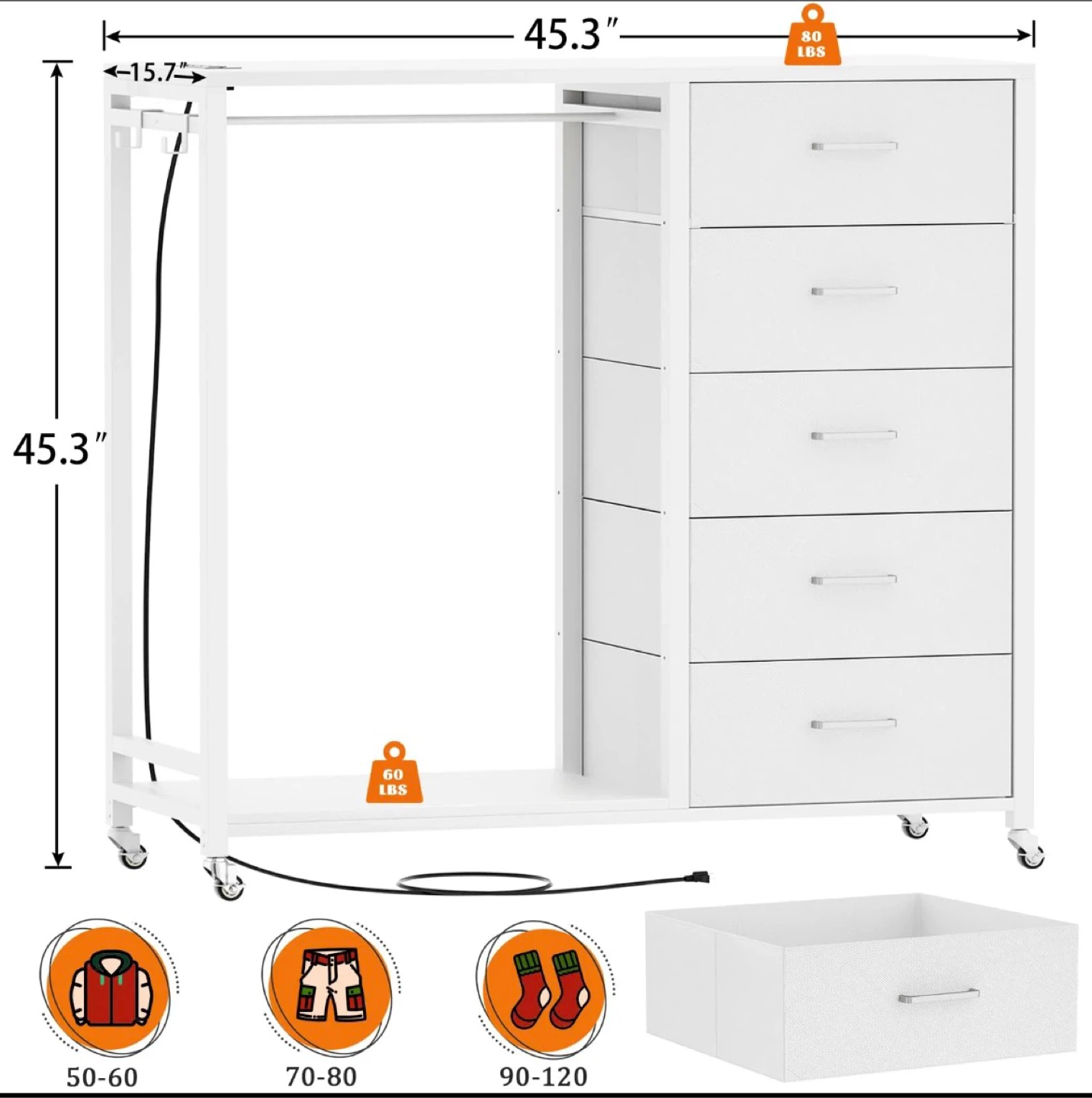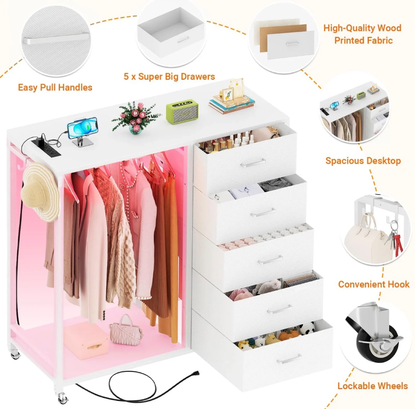 This is a white wardrobe closet with five spacious drawers! It also has a built-in colourful RGB LED light with timing function and DIY different atmospheres as you like. The wardrobe also features a spacious desktop, convenient hooks, and lockable wheels