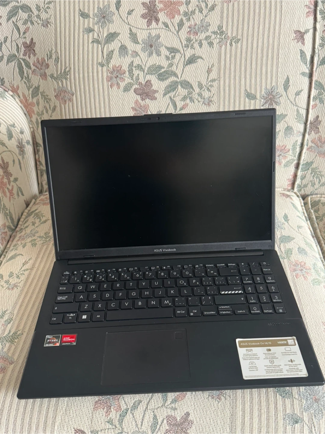 This is an ASUS Vivobook laptop. It's black and comes with its original box. This model features an AMD Ryzen processor.