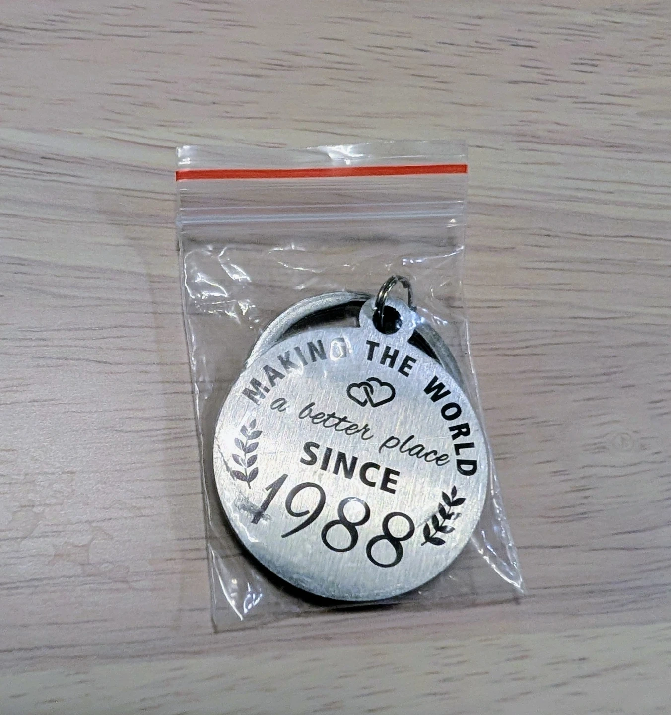Commemorative keychain reading "Making the World a Better Place Since 1988". It's a round, metal pendant with a keyring. This item is still in its original plastic packaging.