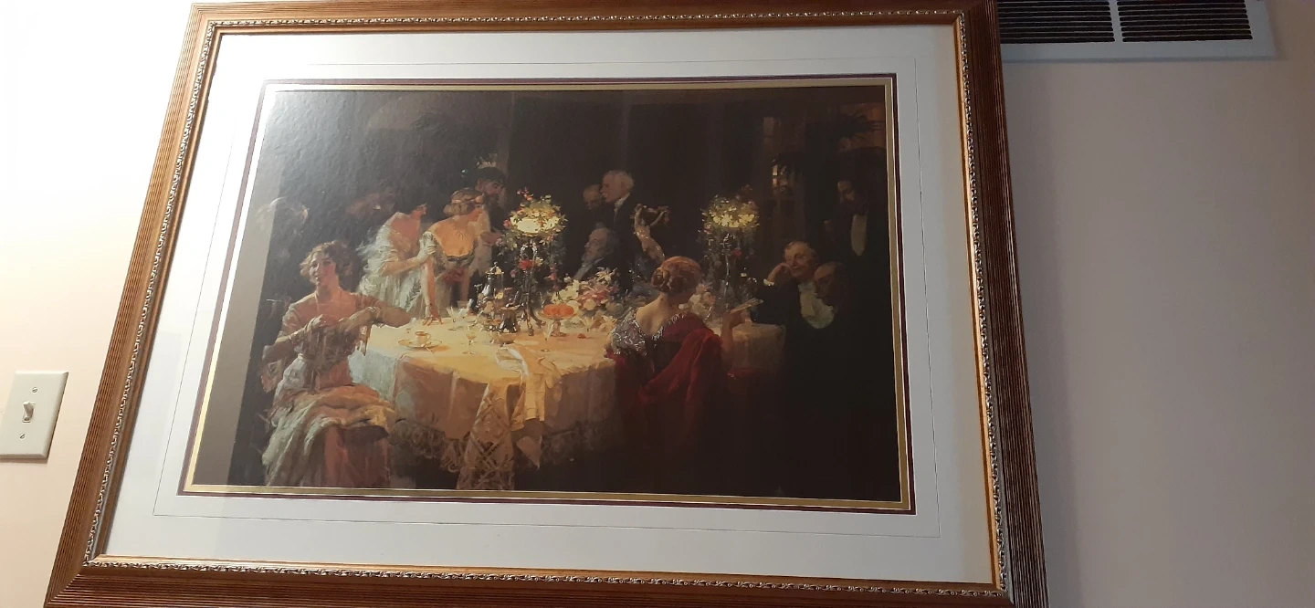 This framed print depicts a vibrant Victorian-era dinner party with many figures gathered around a table. The artwork is housed in a decorative wooden frame with a matting. It's a large piece, ready to add a touch of classic elegance to your home decor.