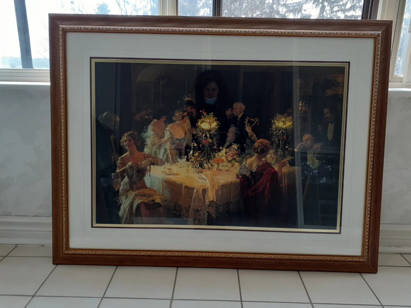 This framed print depicts a vibrant Victorian-era dinner party with many figures gathered around a table. The artwork is housed in a decorative wooden frame with a matting. It's a large piece, ready to add a touch of classic elegance to your home decor.