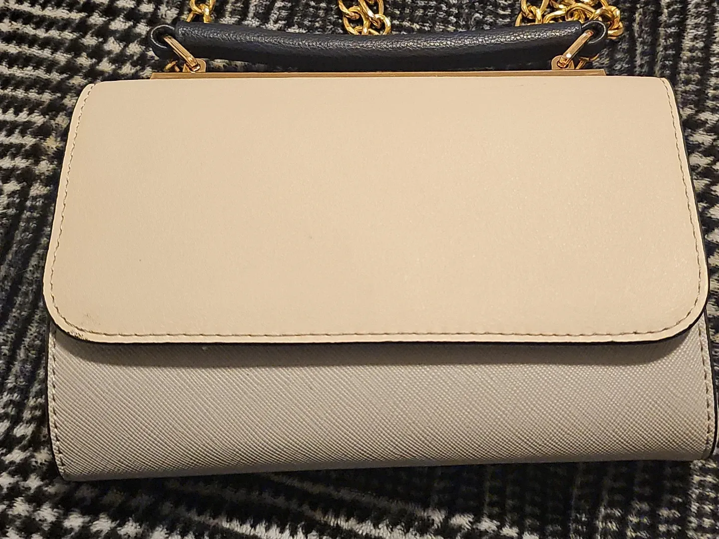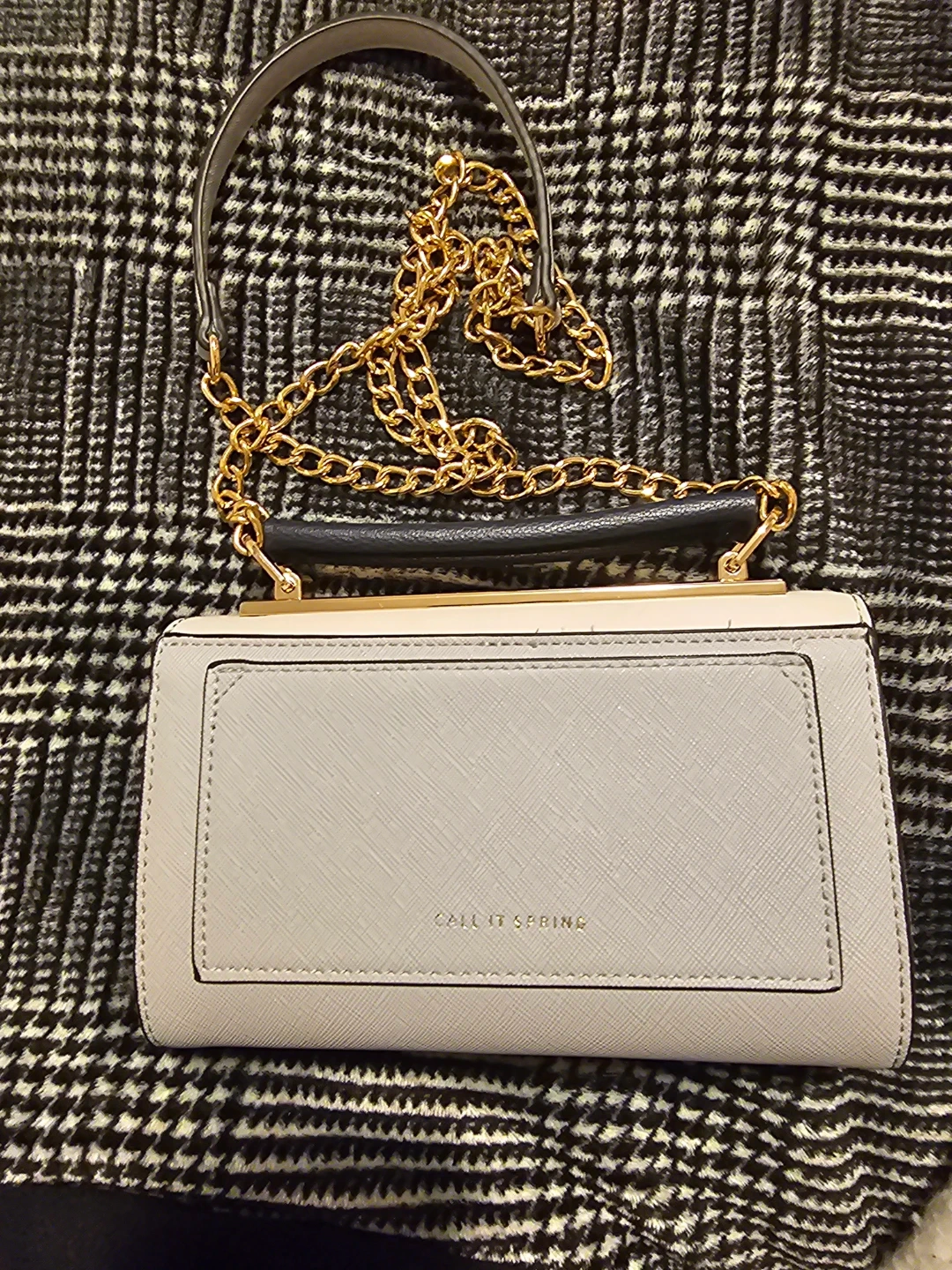Here's a stylish Call It Spring crossbody bag! It features a grey and beige colour scheme with a gold chain strap. Perfect for adding a touch of elegance to any outfit