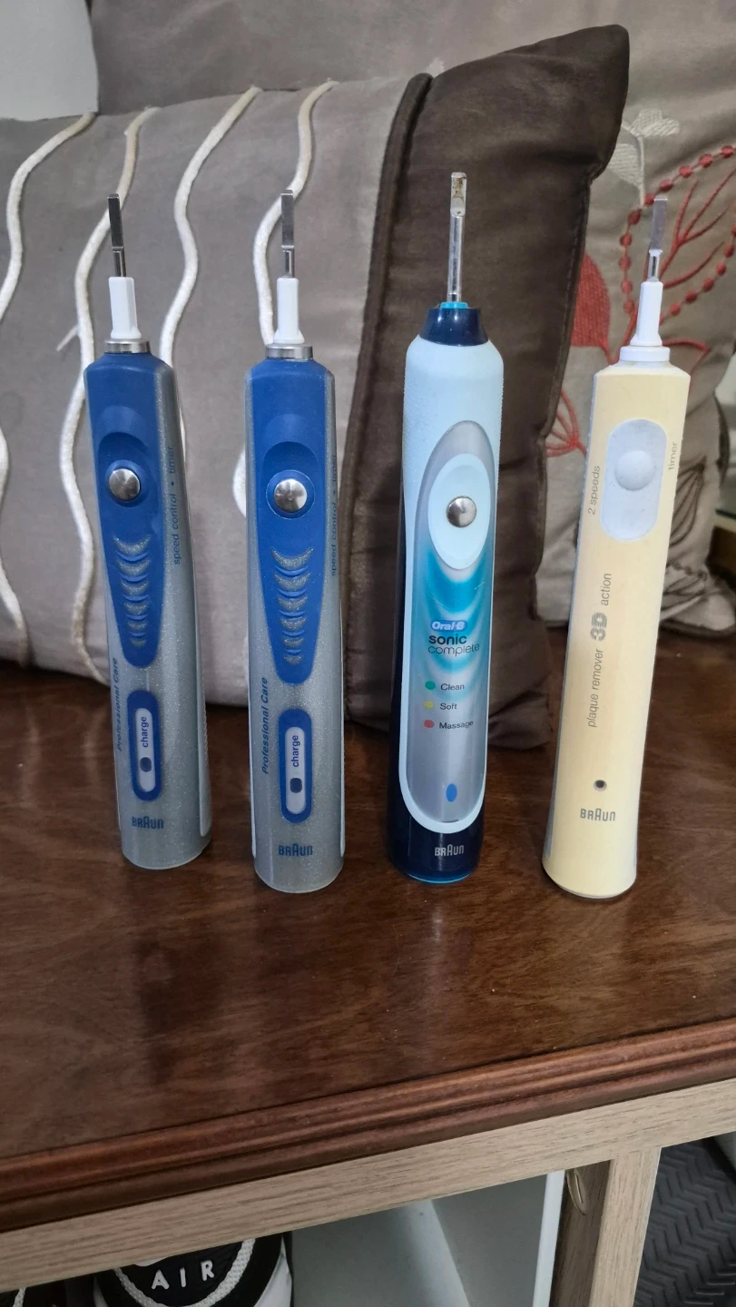 Braun Oral-B electric toothbrushes in various models. Includes Oral-B Pro 1000, Oral-B Sonic Complete, and two Oral-B 3D Action Plaque Remover toothbrushes. All are in working condition and come with charging bases or just Toothbrush.