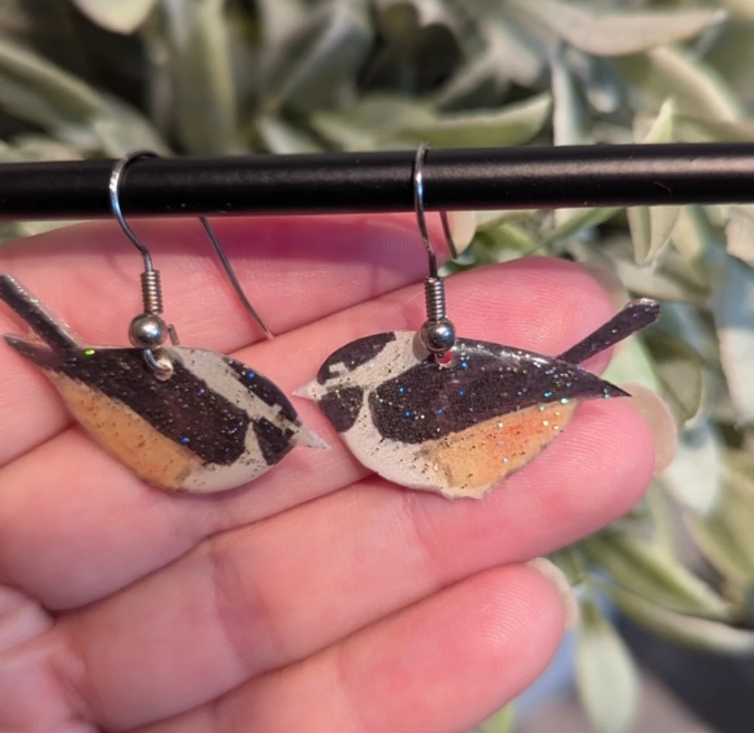 Cute chickadee earrings! These handmade earrings are perfect for bird lovers. They're lightweight and feature a shimmering glitter detail. These would make a fun gift for anyone who enjoys unique accessories.
