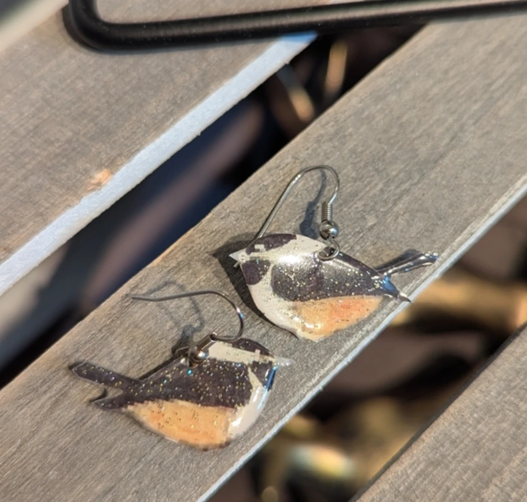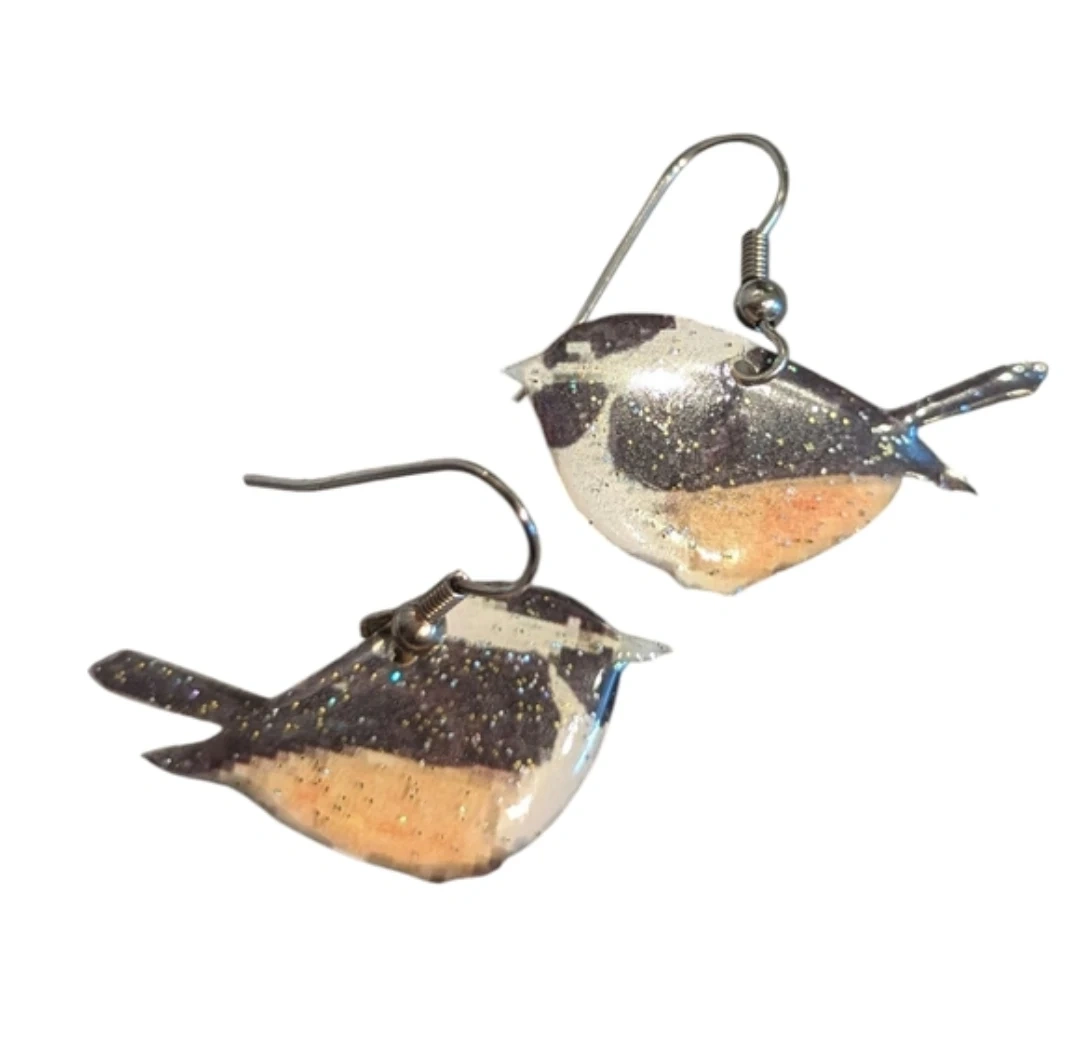 Cute chickadee earrings! These handmade earrings are perfect for bird lovers. They're lightweight and feature a shimmering glitter detail. These would make a fun gift for anyone who enjoys unique accessories.