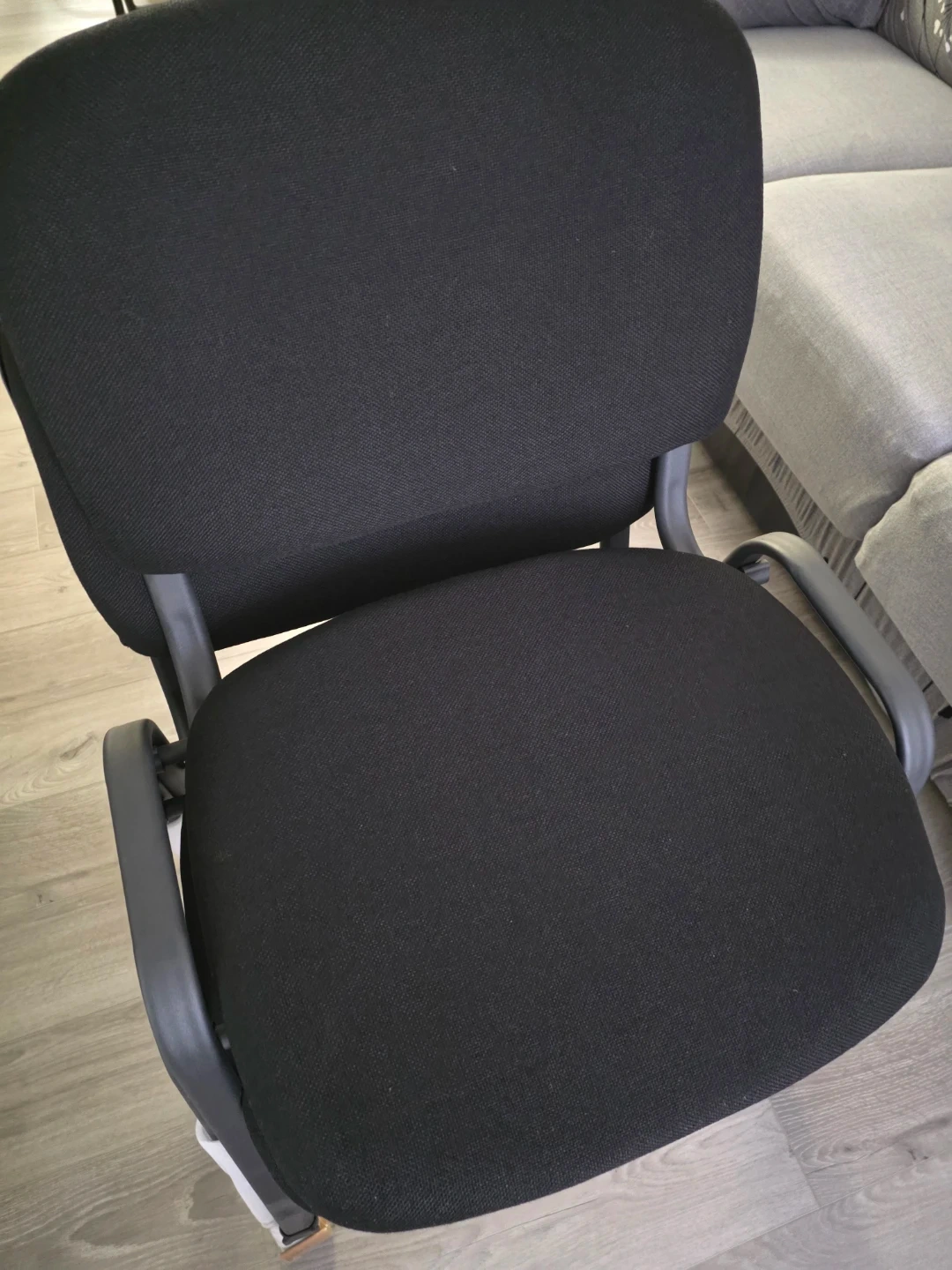 Set of five black fabric conference chairs with metal frames. These chairs are stackable for easy storage. They have an ergonomic design with a reclined backrest for optimal spine support. Fabric upholstery.