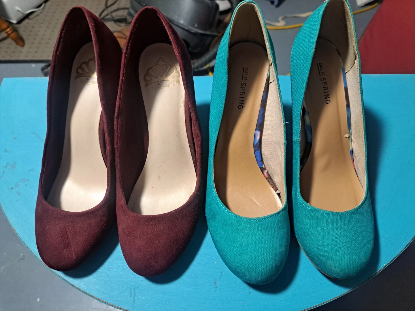 A collection of women's heels in various styles and colours. Includes lace-up blue heels, gold strappy heels, black pumps and peep-toe heels, burgundy pumps, and teal block heels. Brands visible include Call It Spring, Fergie Footwear, and XOXO.