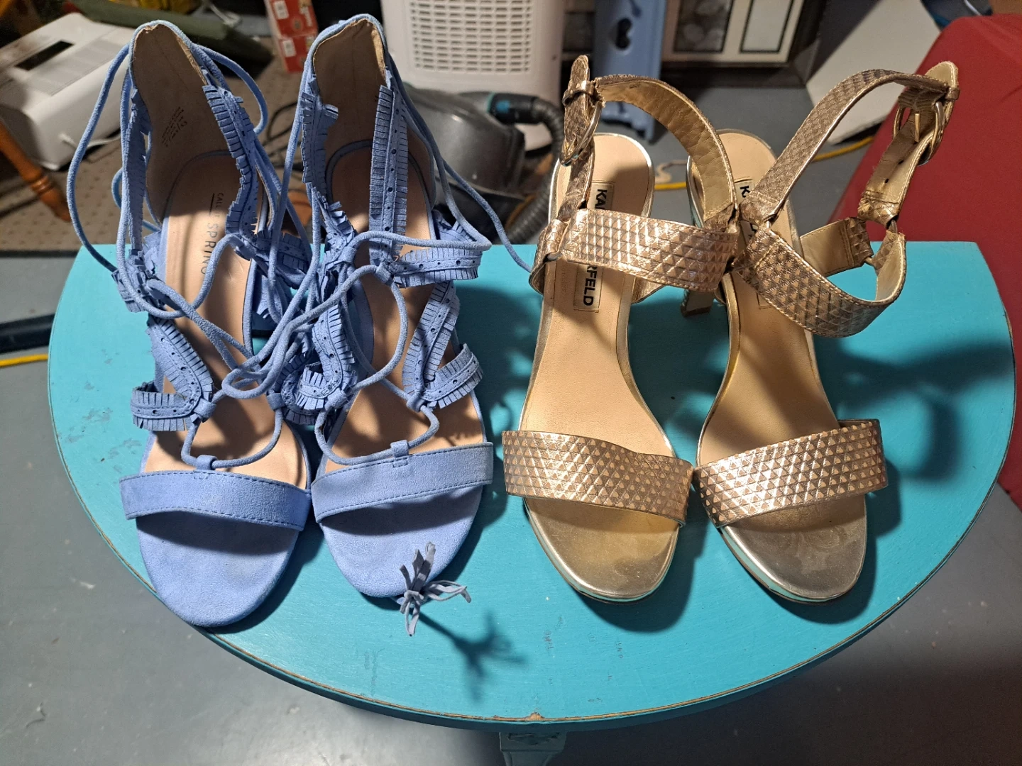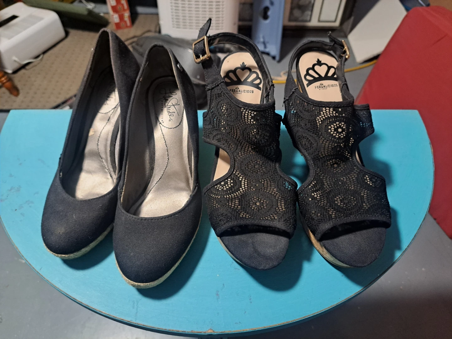 A collection of women's heels in various styles and colours. Includes lace-up blue heels, gold strappy heels, black pumps and peep-toe heels, burgundy pumps, and teal block heels. Brands visible include Call It Spring, Fergie Footwear, and XOXO.