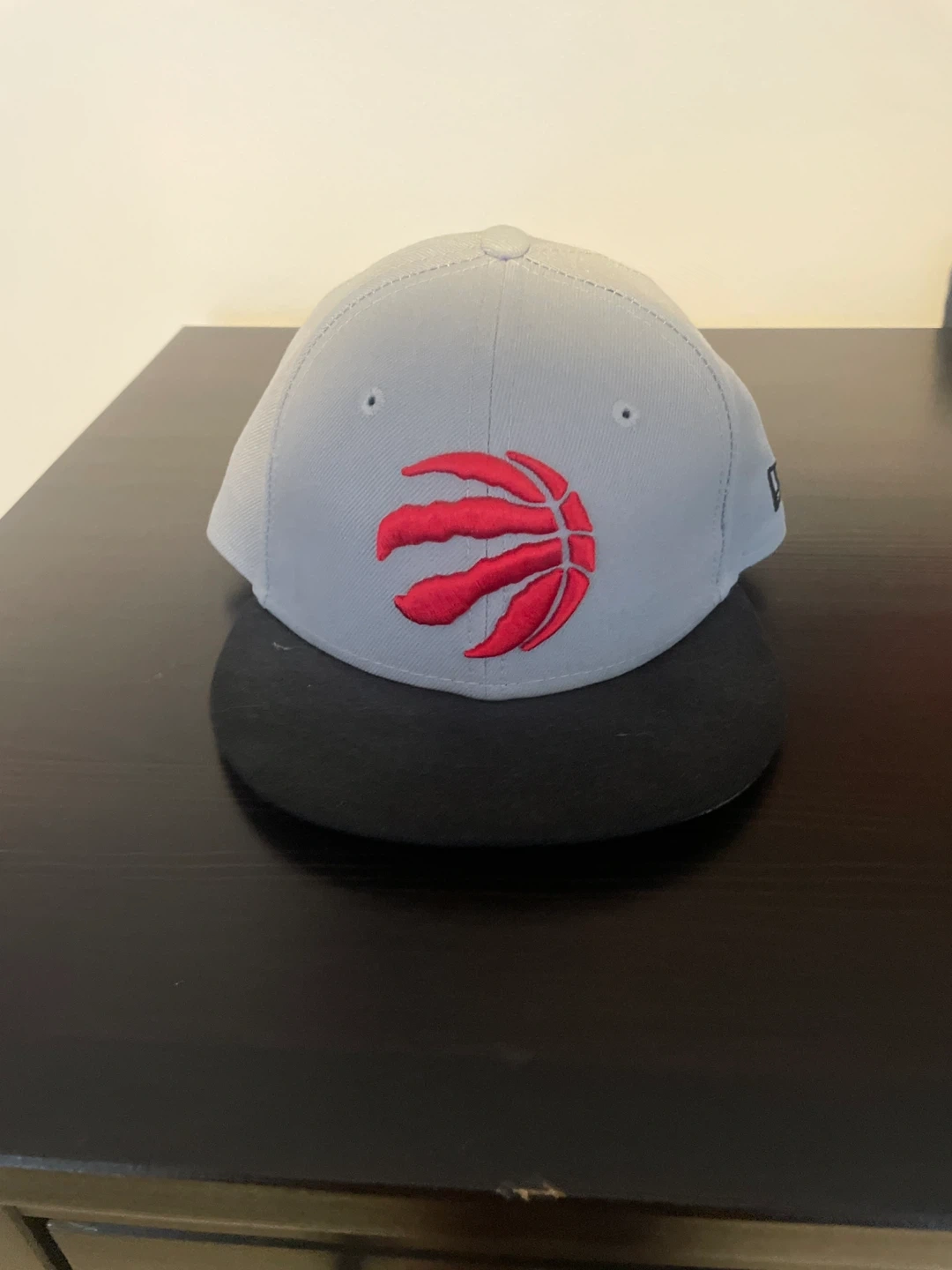 This is a New Era baseball cap featuring the Toronto Raptors logo. It's a grey cap with a black brim. The NBA logo is also visible on the back.