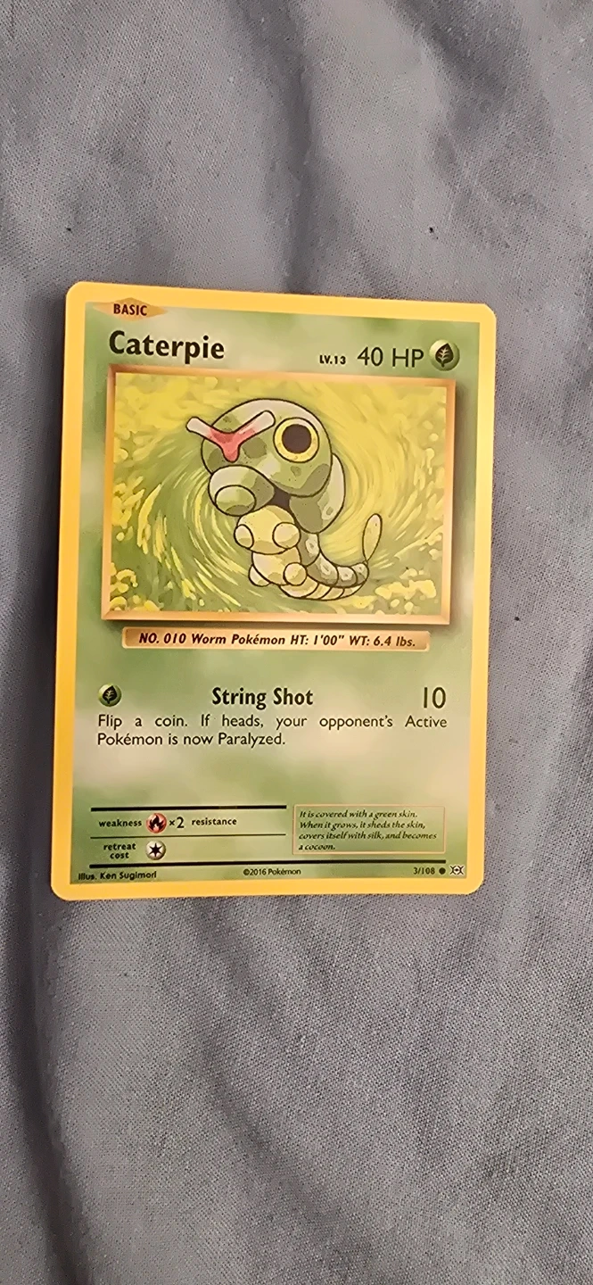 This is a Pokémon Trading Card featuring Caterpie. It's from the 2016 set. The card details are: No. 010 Worm Pokémon, HT: 1'00", WT: 6.4 lbs.