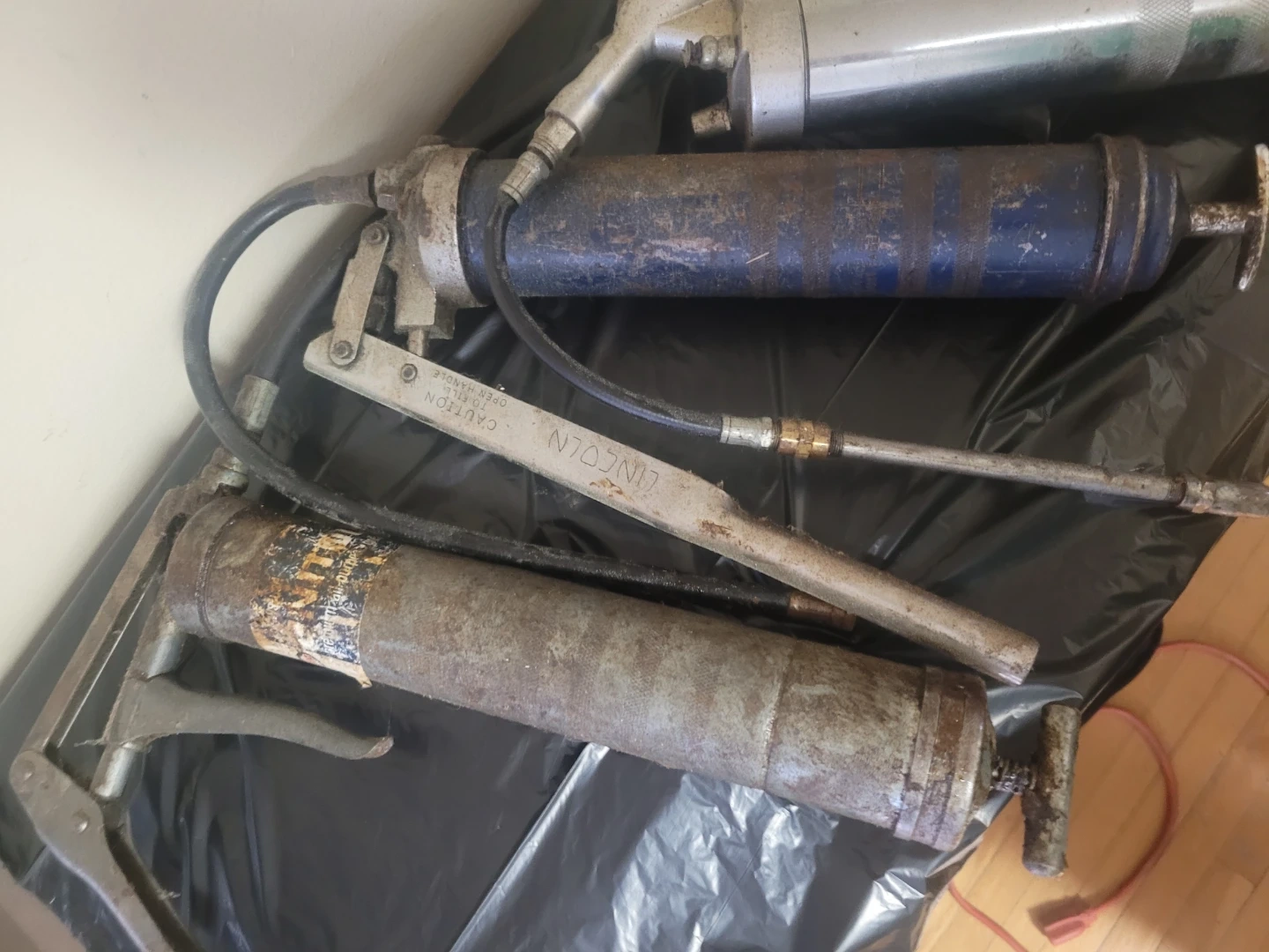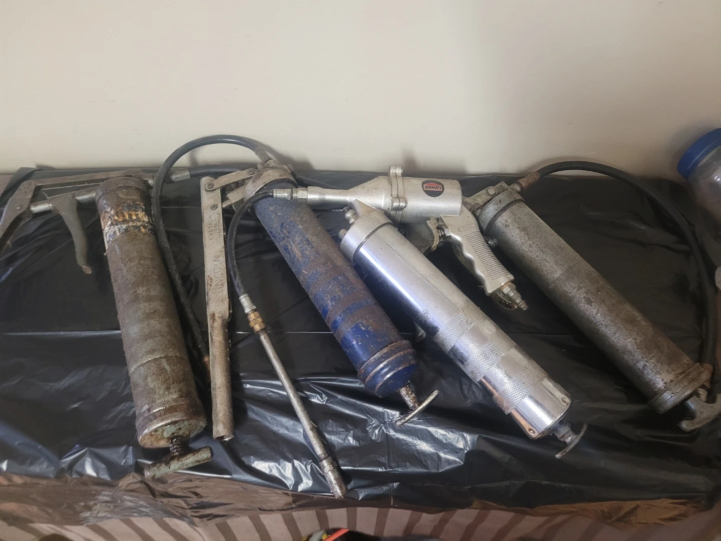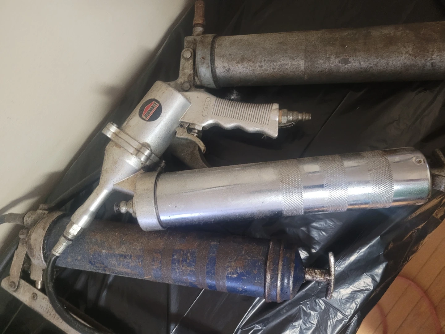 Includes a Lincoln lever-action grease gun and three other grease guns. These are for heavy-duty use. Various sizes and types included.