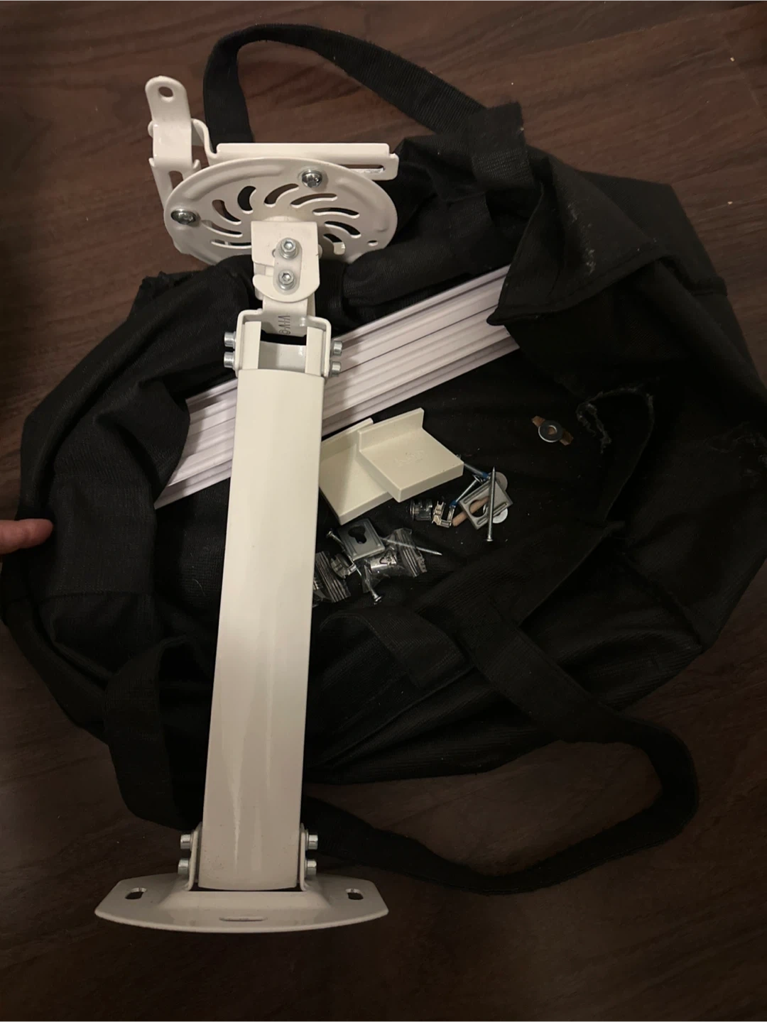 This is a white projector ceiling mount. It includes all necessary hardware for installation. It also comes with a black carrying bag.