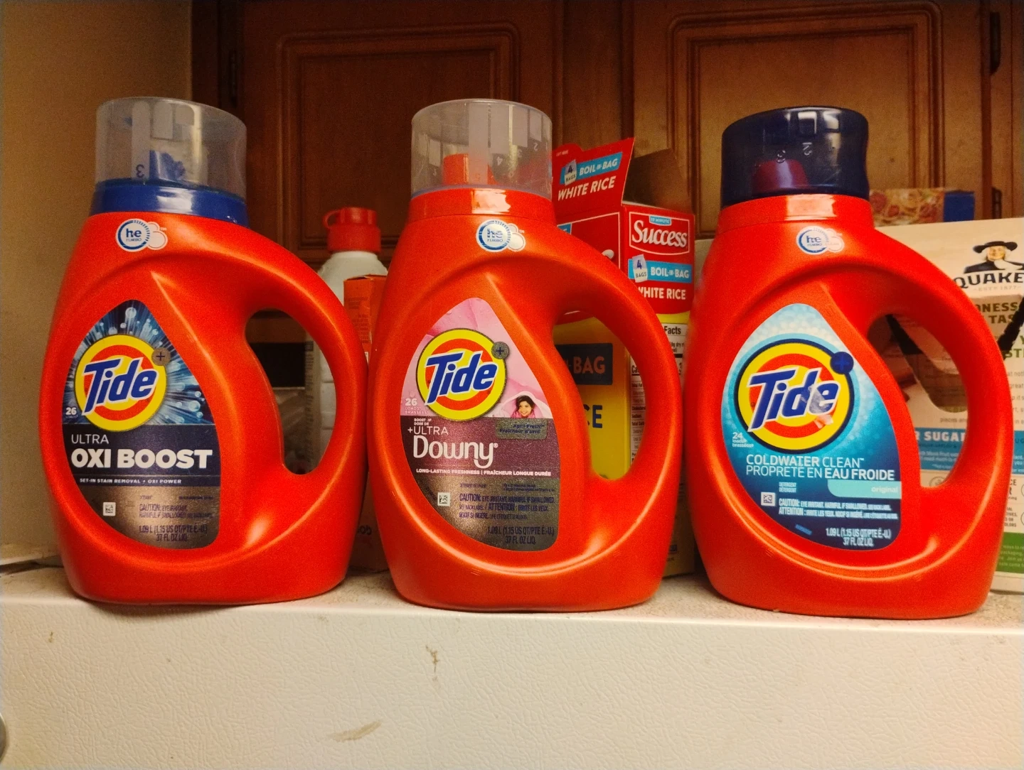 Three bottles of Tide liquid laundry detergent are included: Ultra Oxi Boost, Ultra Downy with long-lasting freshness, and Coldwater Clean. Each bottle contains 1.09L (37 fl oz).