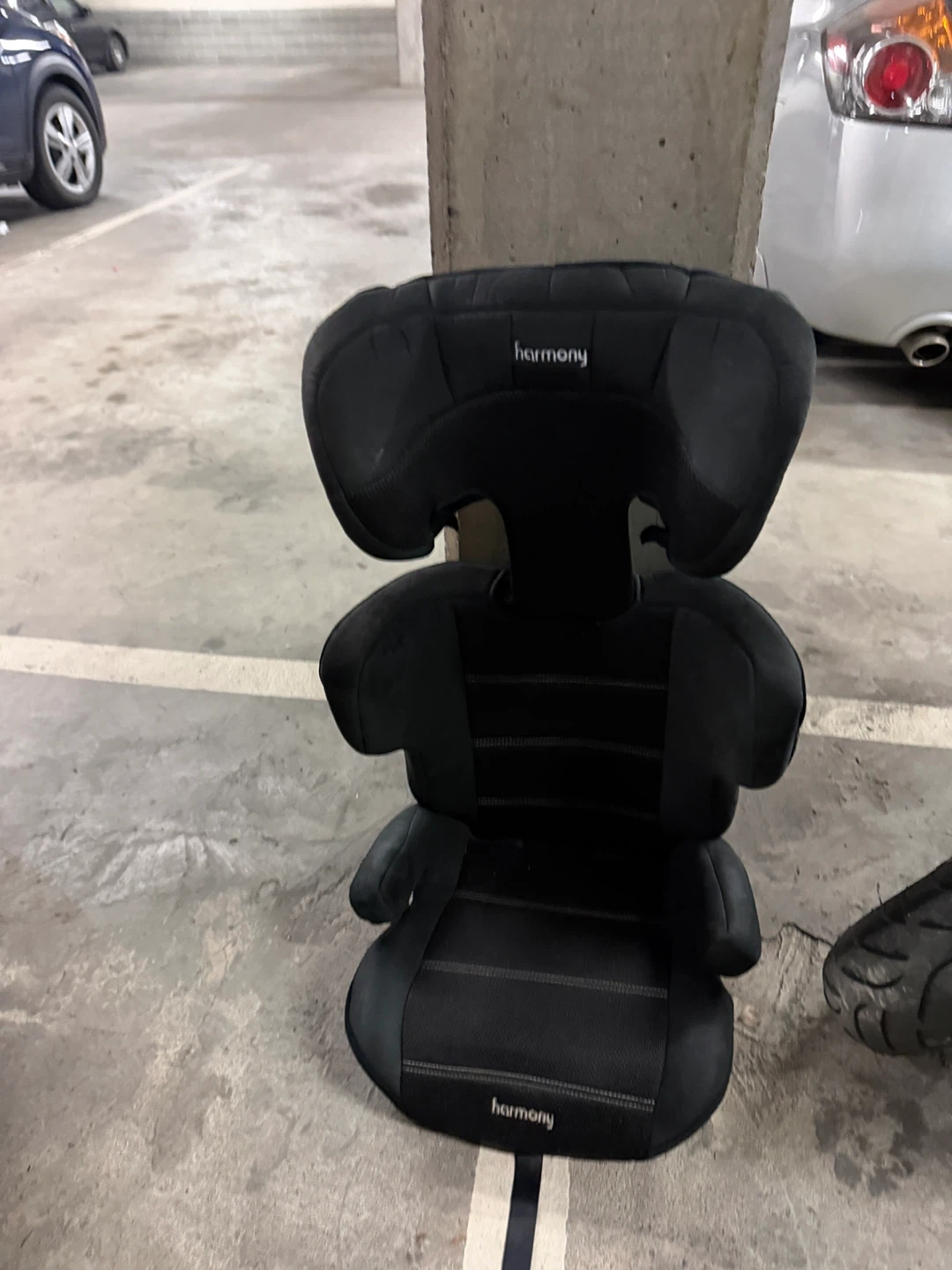 This is a black Harmony booster car seat. It's made with fabric and has adjustable head support. Suitable for children needing a booster seat.