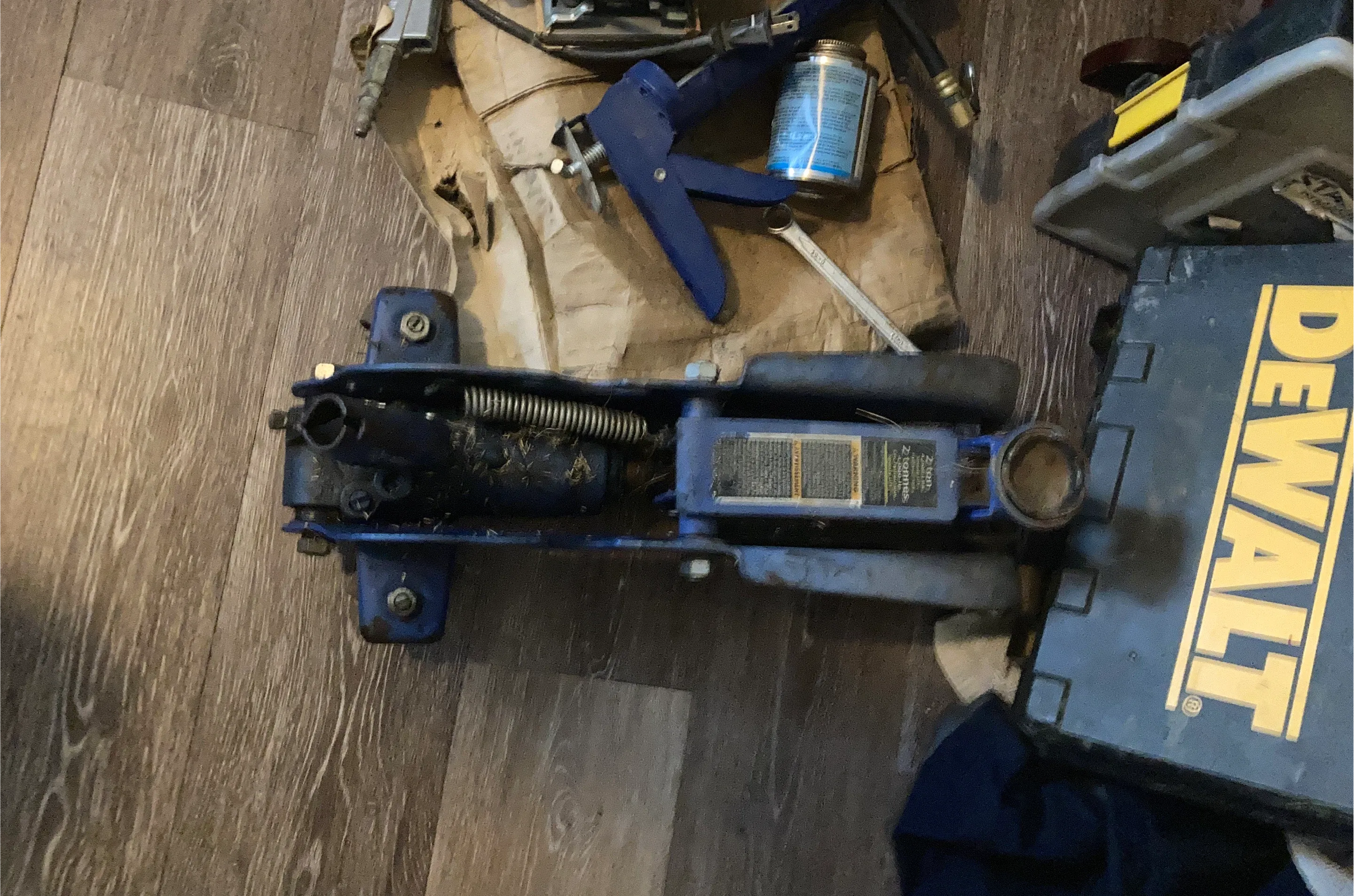 This is a blue 2-ton hydraulic floor jack. It's made of metal. This jack is useful for lifting vehicles for maintenance or repairs. It's a sturdy piece of equipment for any garage.