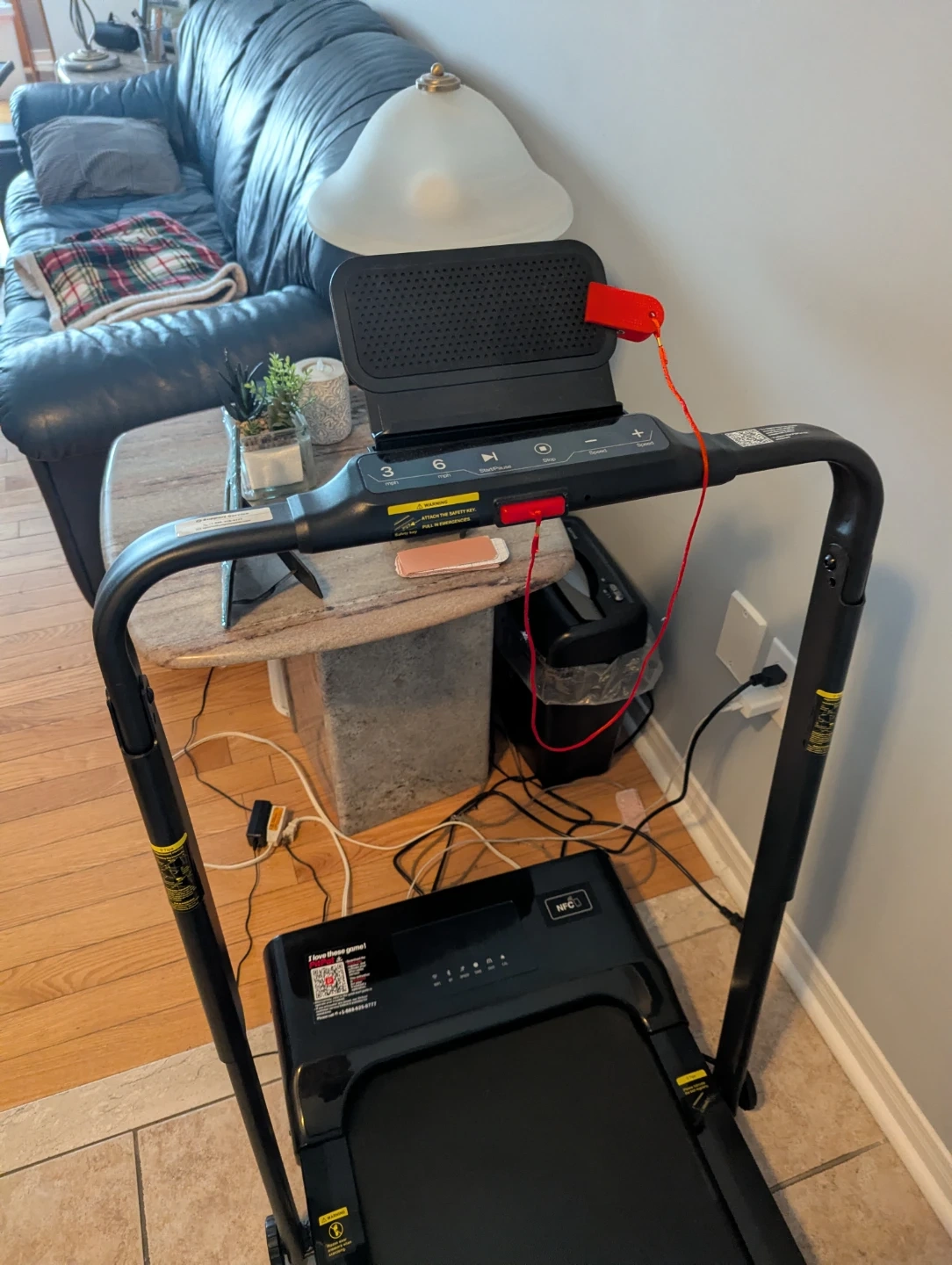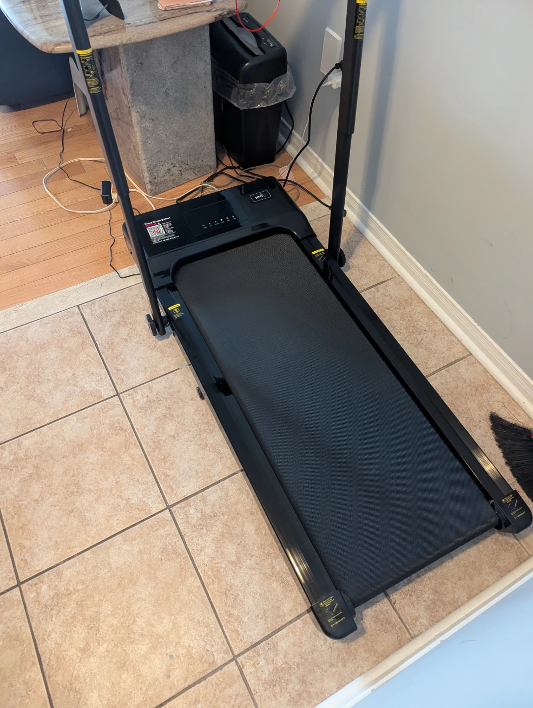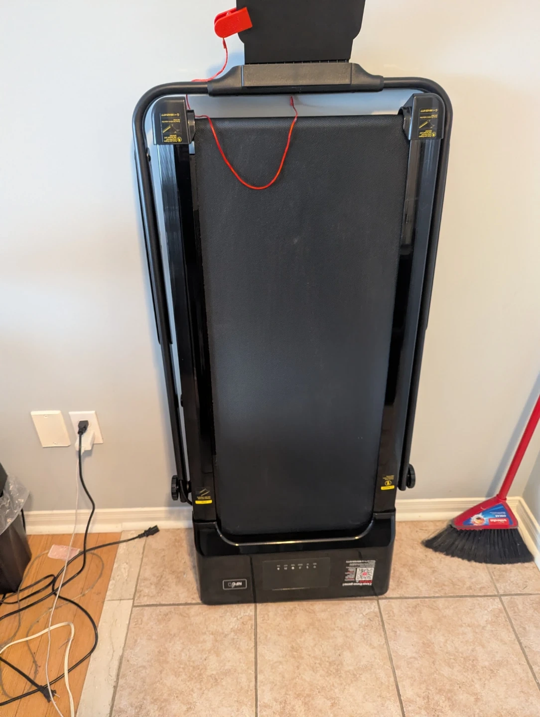 This NFCFIT walking pad treadmill is black and foldable. It's great for getting your steps in indoors. The running belt is black and has a safety tether included.