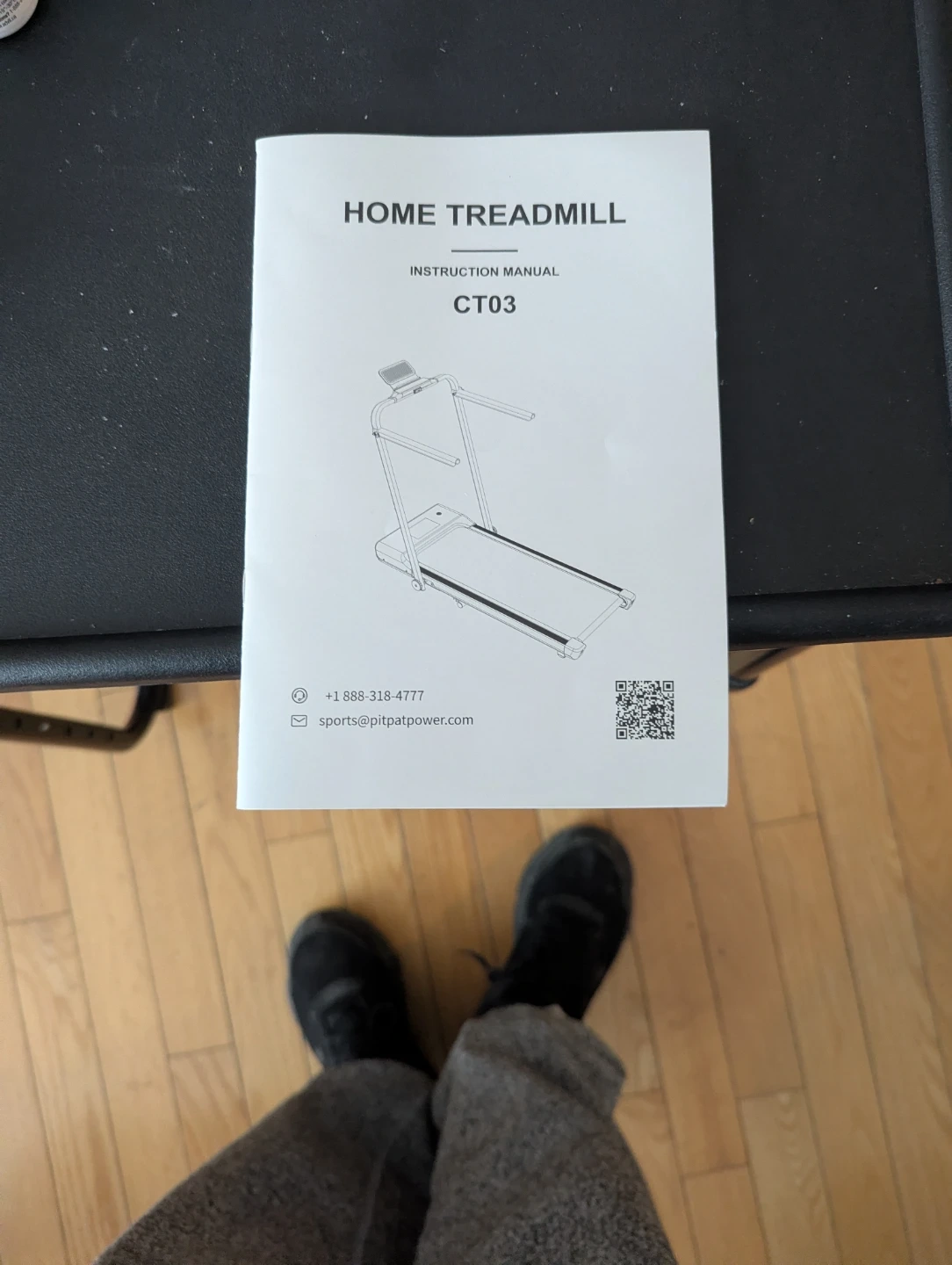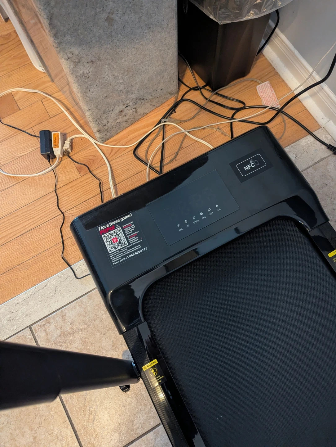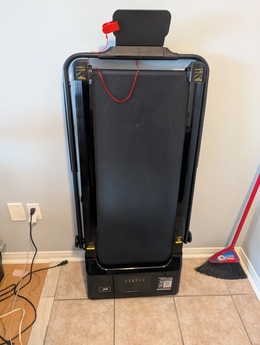 This NFCFIT walking pad treadmill is black and foldable. It's great for getting your steps in indoors. The running belt is black and has a safety tether included.