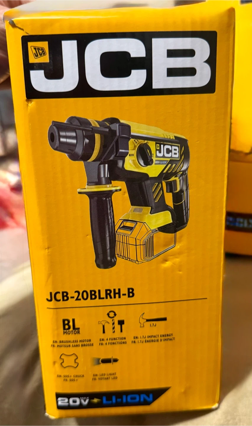 Selling a brand new JCB-20BLRH-B 20V LI-ION rotary hammer drill, still in its original box! This powerful tool features a brushless motor and delivers 1.7J of impact energy. It also has an LED light for better visibility. Perfect for various drilling and hammering tasks