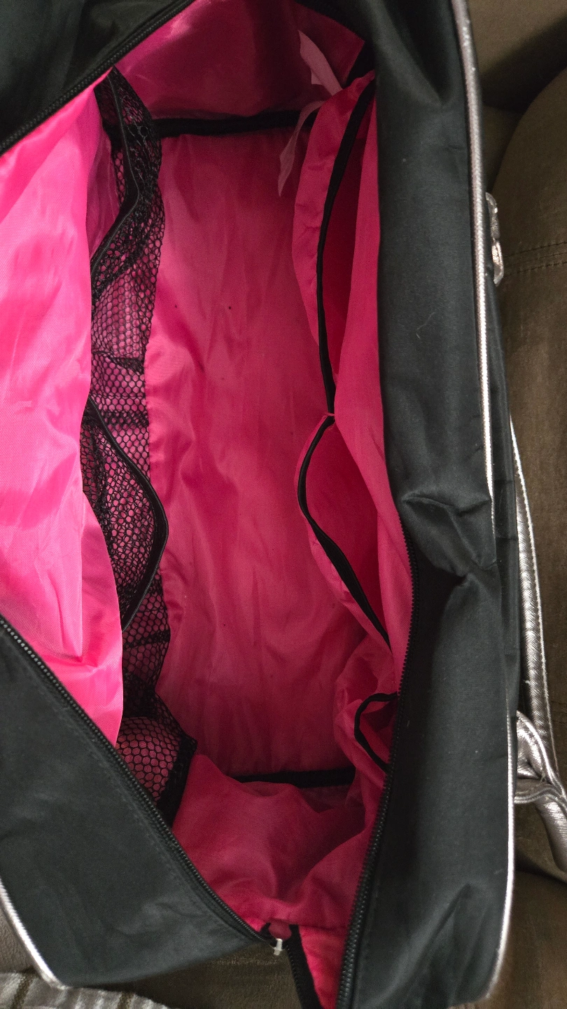 Check out this used Avon travel bag, perfect for your next getaway! This stylish black bag features silver accents and a spacious pink interior with multiple compartments to keep your belongings organized. It's in good condition and ready for new adventures.