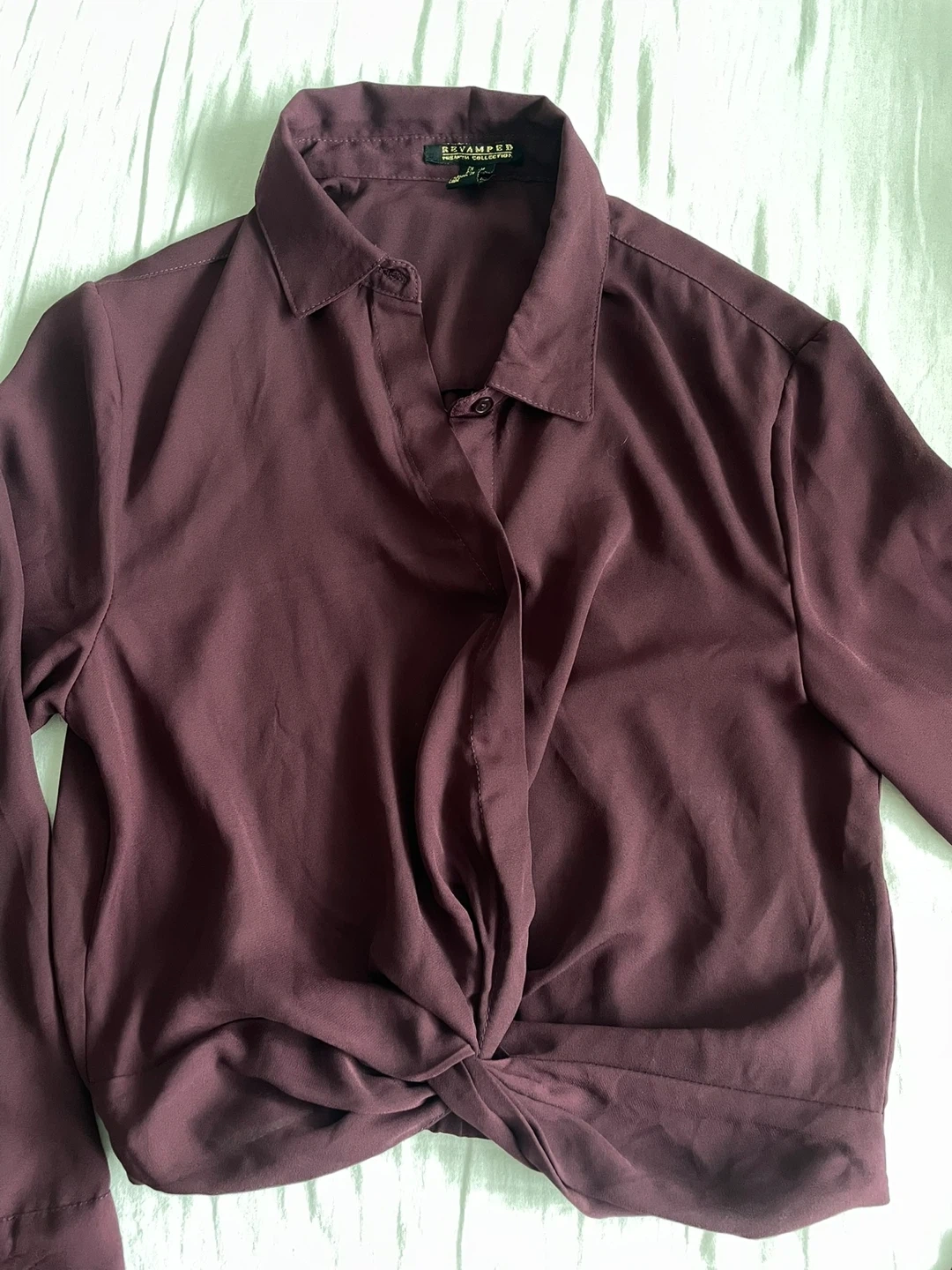 A stylish button-front top with a flattering knot detail at the waist. It features long sleeves with button cuffs.
