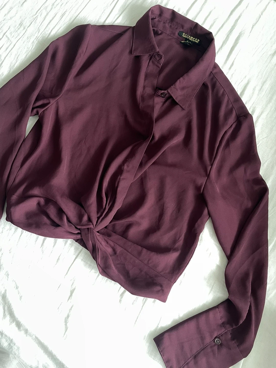 A stylish button-front top with a flattering knot detail at the waist. It features long sleeves with button cuffs.