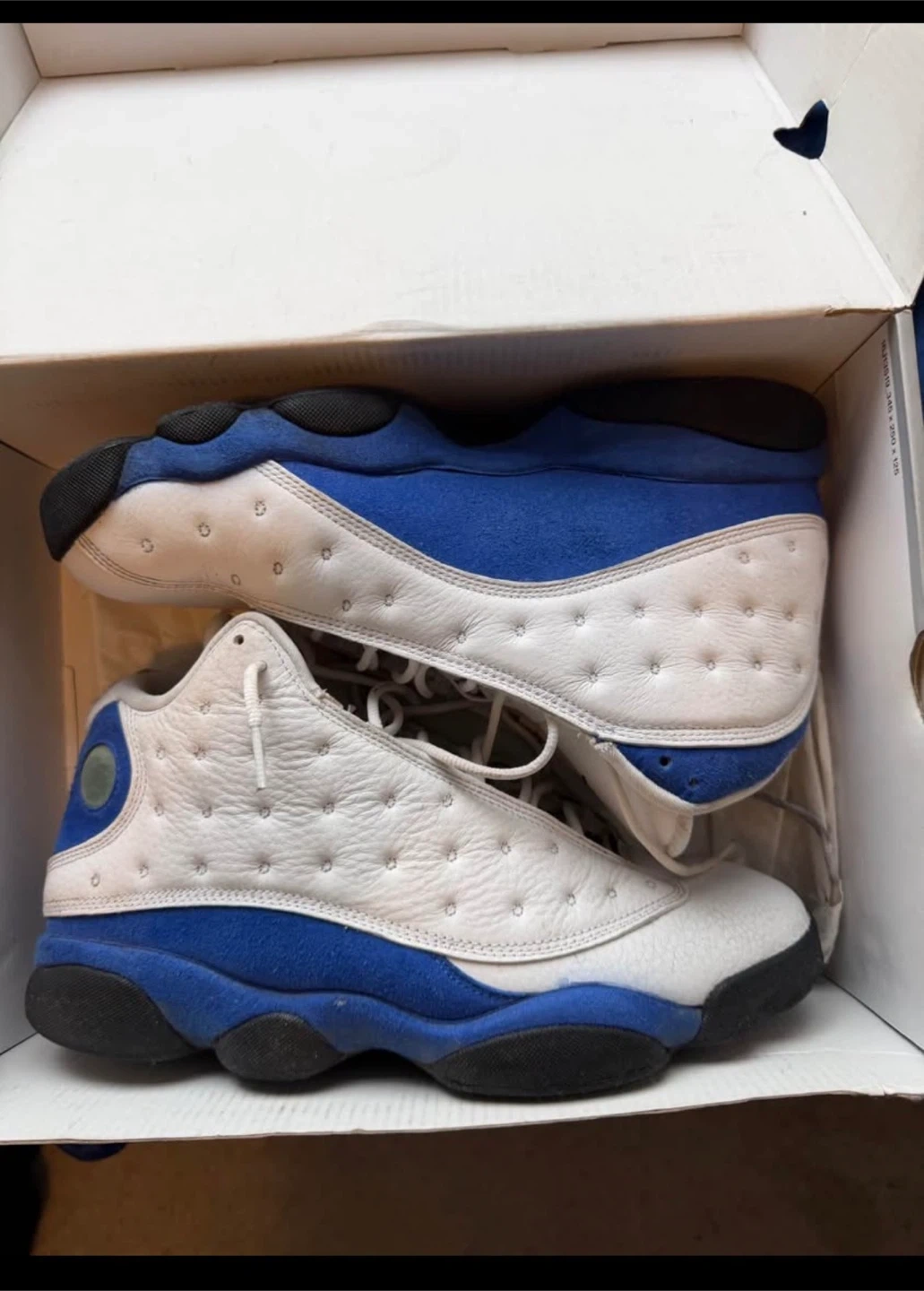These are the Air Jordan 13 Retro sneakers in a white and royal blue colourway. They come in their original box. These kicks are designed for comfort and style. Used