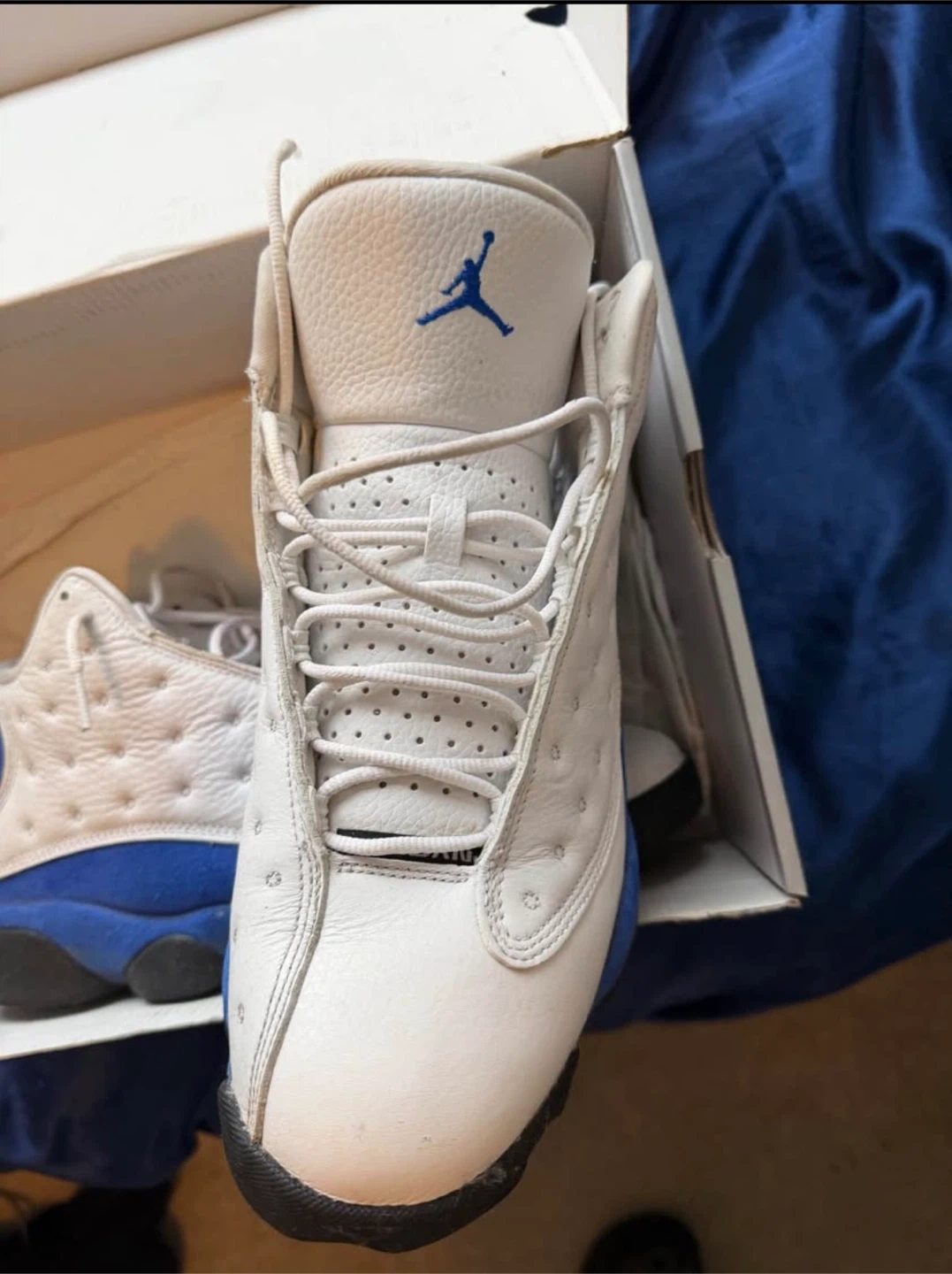 These are the Air Jordan 13 Retro sneakers in a white and royal blue colourway. They come in their original box. These kicks are designed for comfort and style. Used