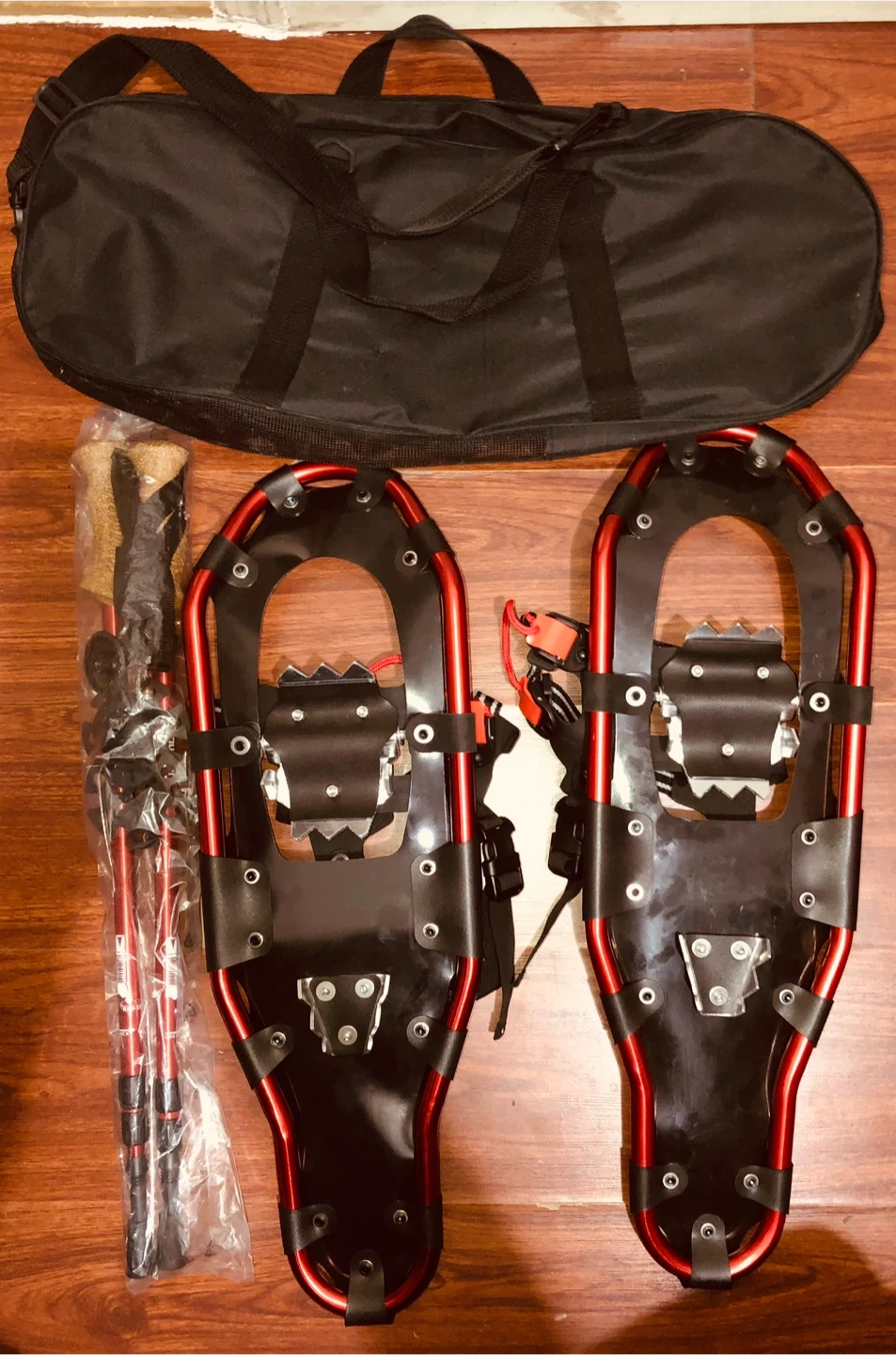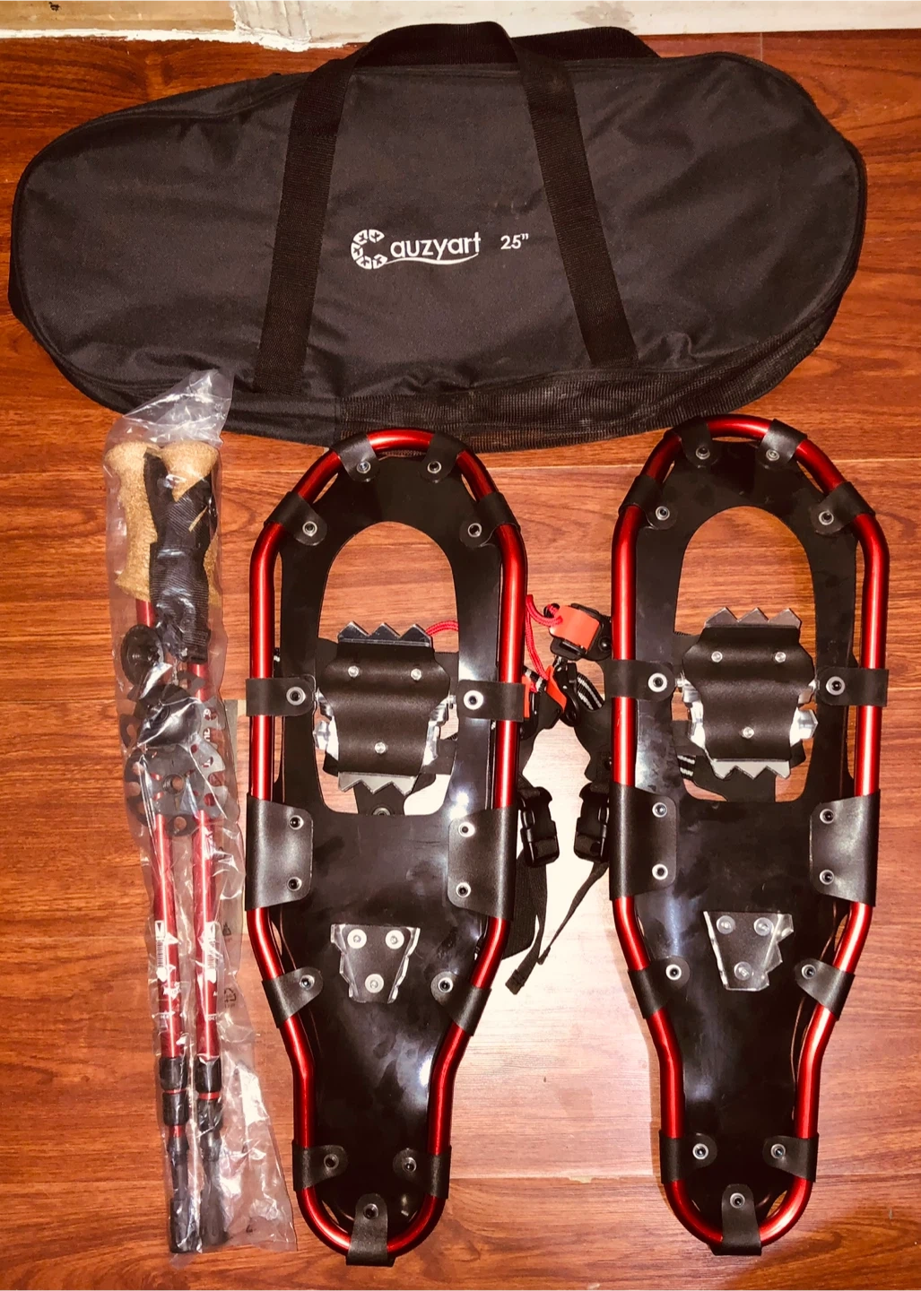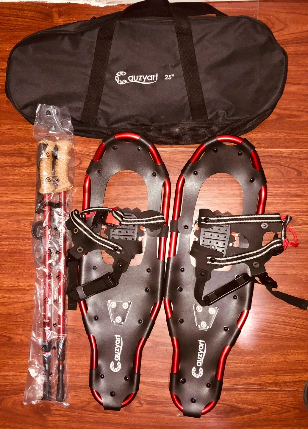 Get ready for winter adventures with this set of AUZYART 25" snowshoes! Included are the snowshoes, adjustable poles, and a convenient carrying bag. Everything you need to hit the trails is right here