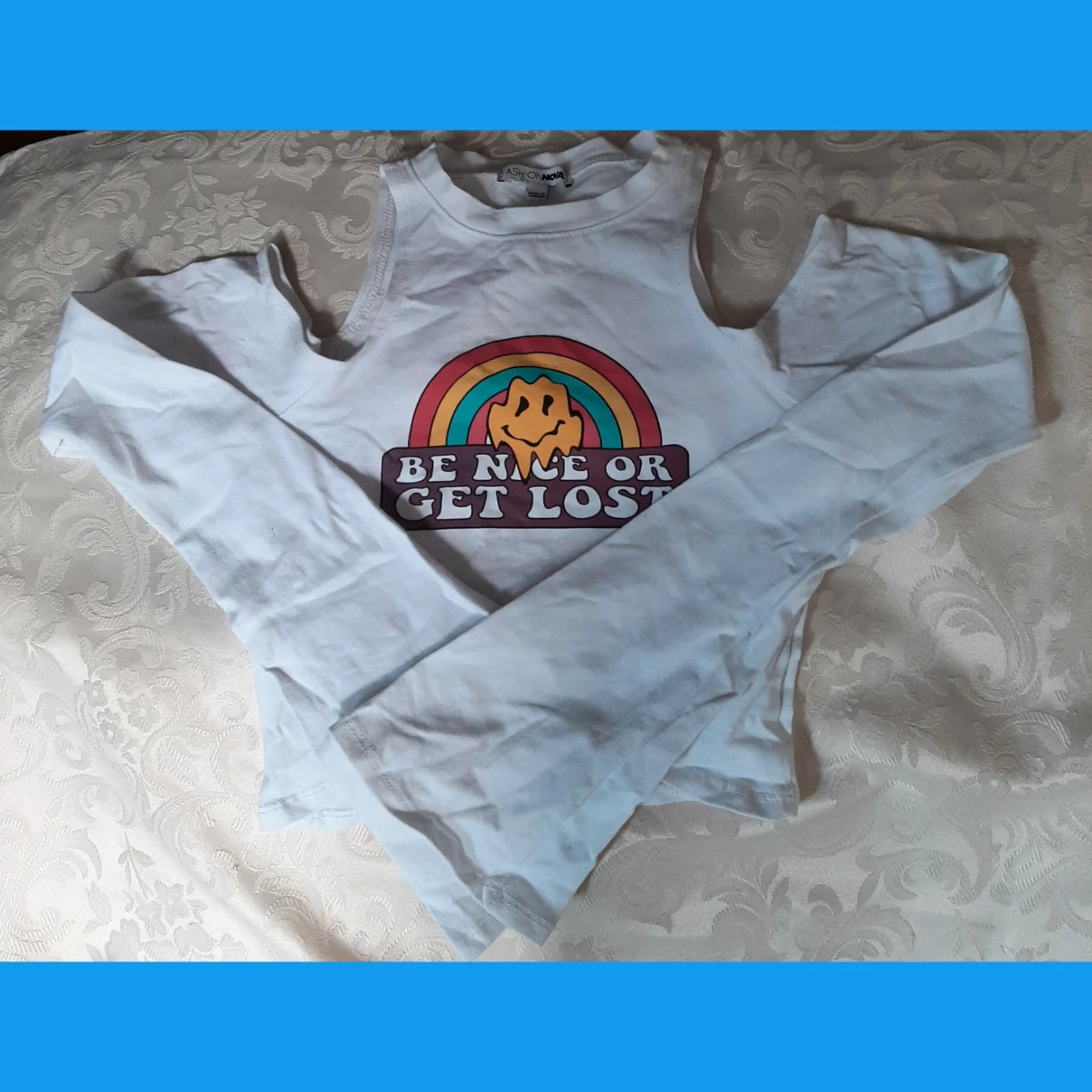 White long-sleeved top from Fashion Nova. It features a cold shoulder design and a colourful rainbow graphic with text. Made of comfortable material, size S
