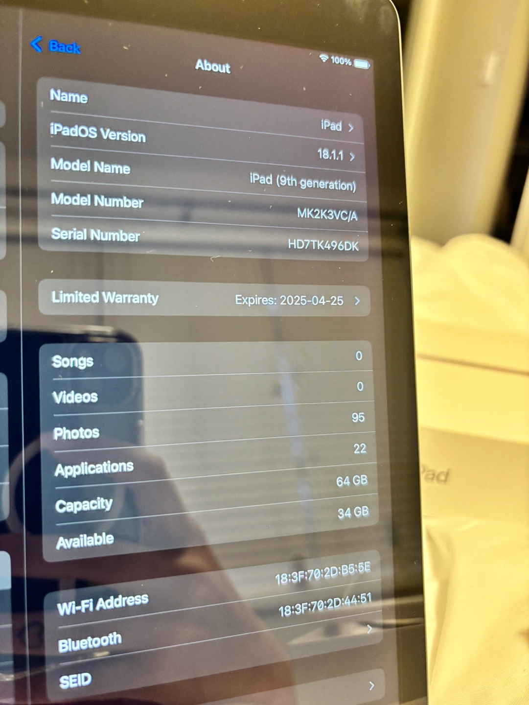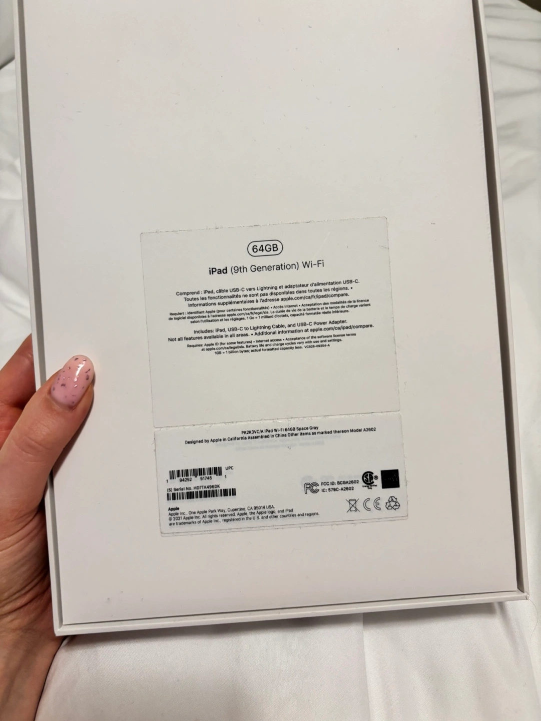 45iPad 9th generation. 64GB, Space Grey. Includes box and charging cable, without adapter. Used, excellent condition. Pick up in Langley