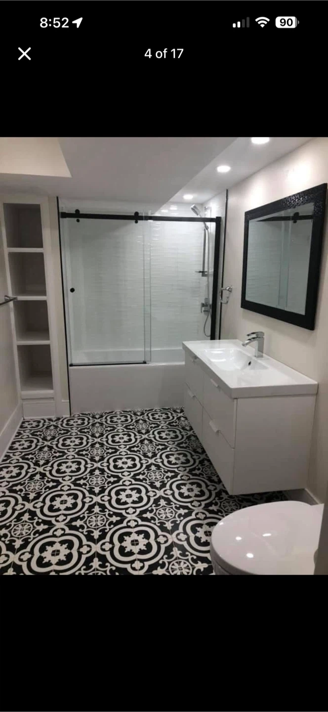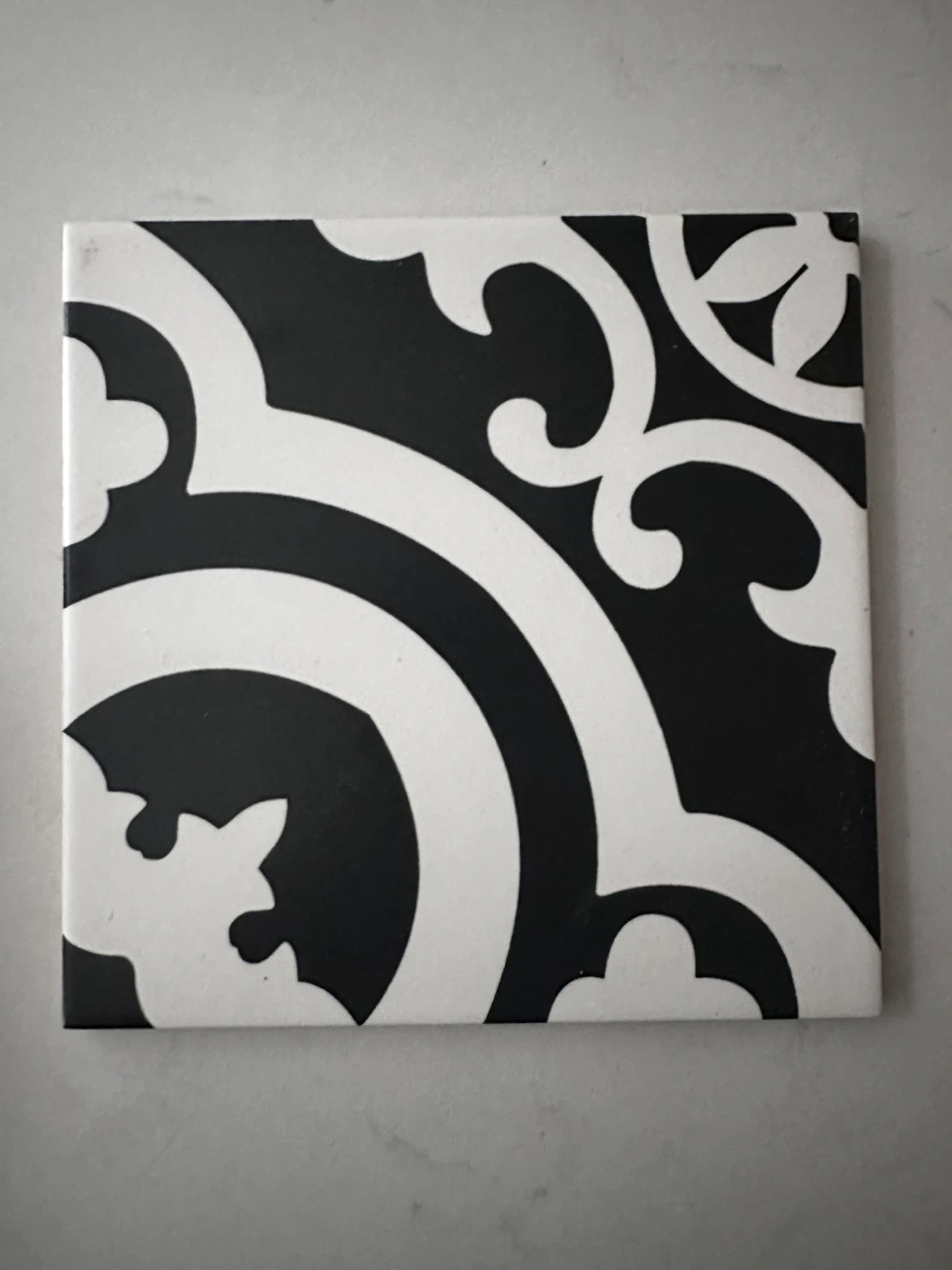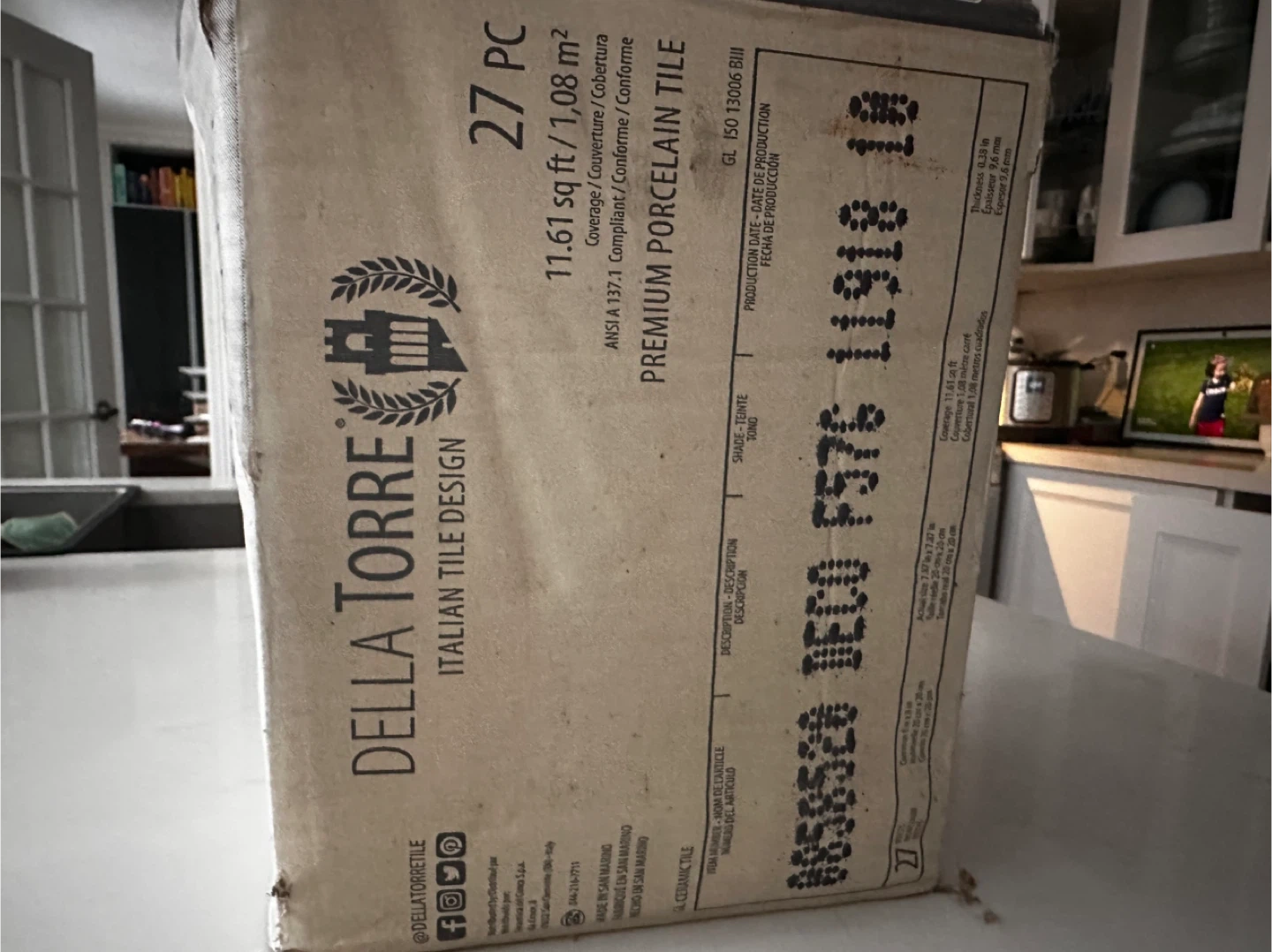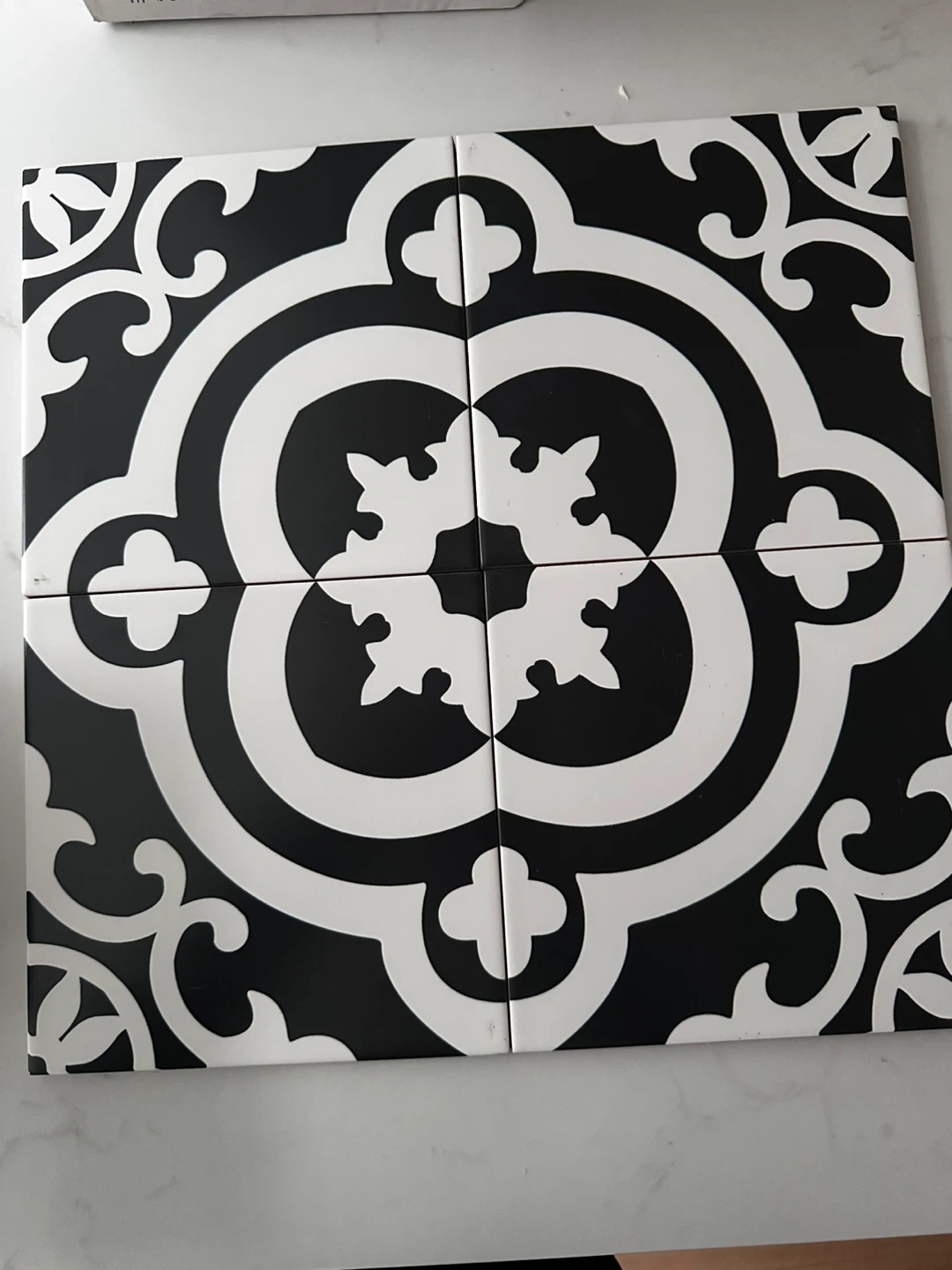 5 boxes plus extra, DELLA TORRE premium porcelain tiles. 27 PC, covering 11.61 sq ft. These tiles feature an intricate black and white pattern. Italian made.