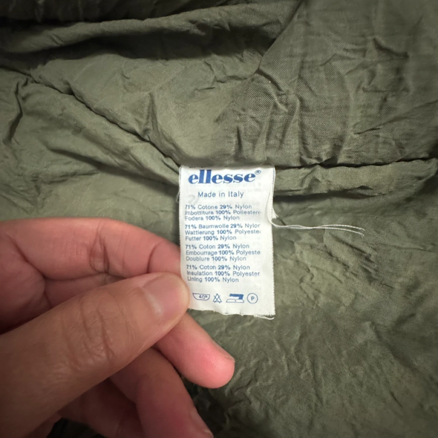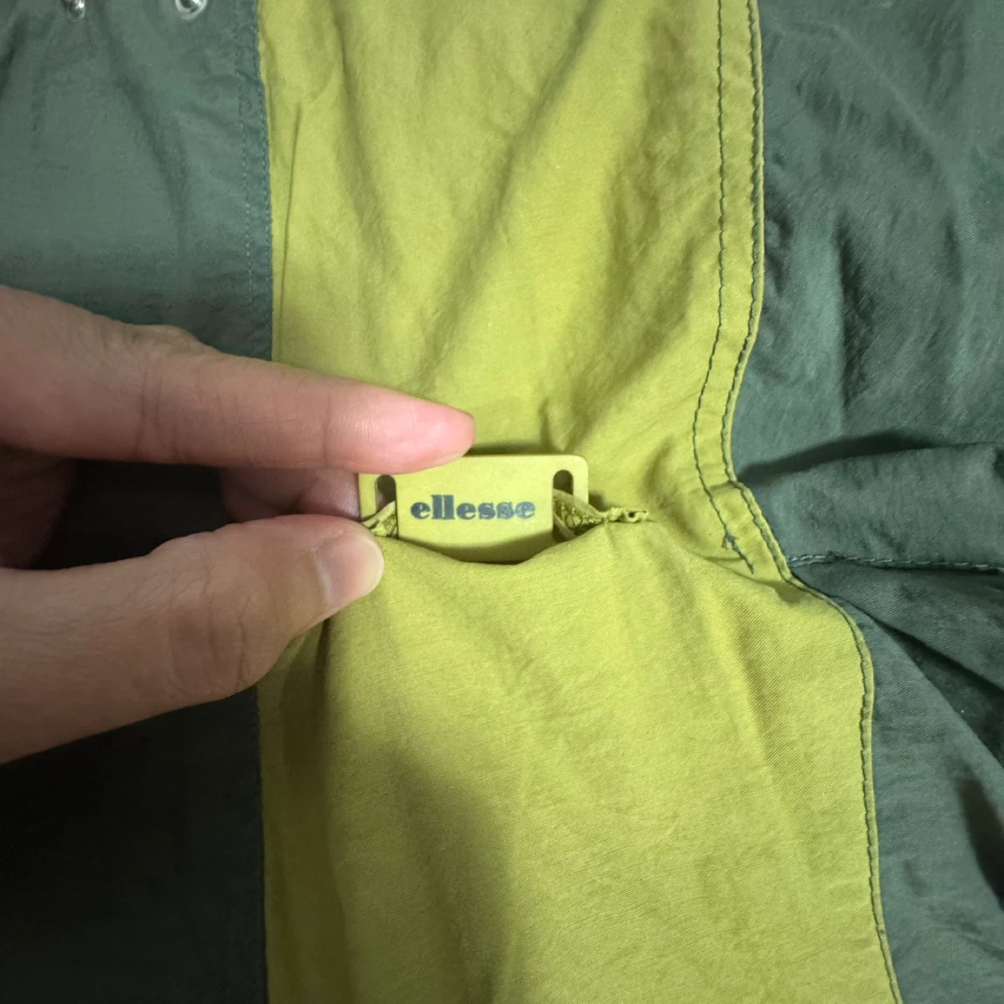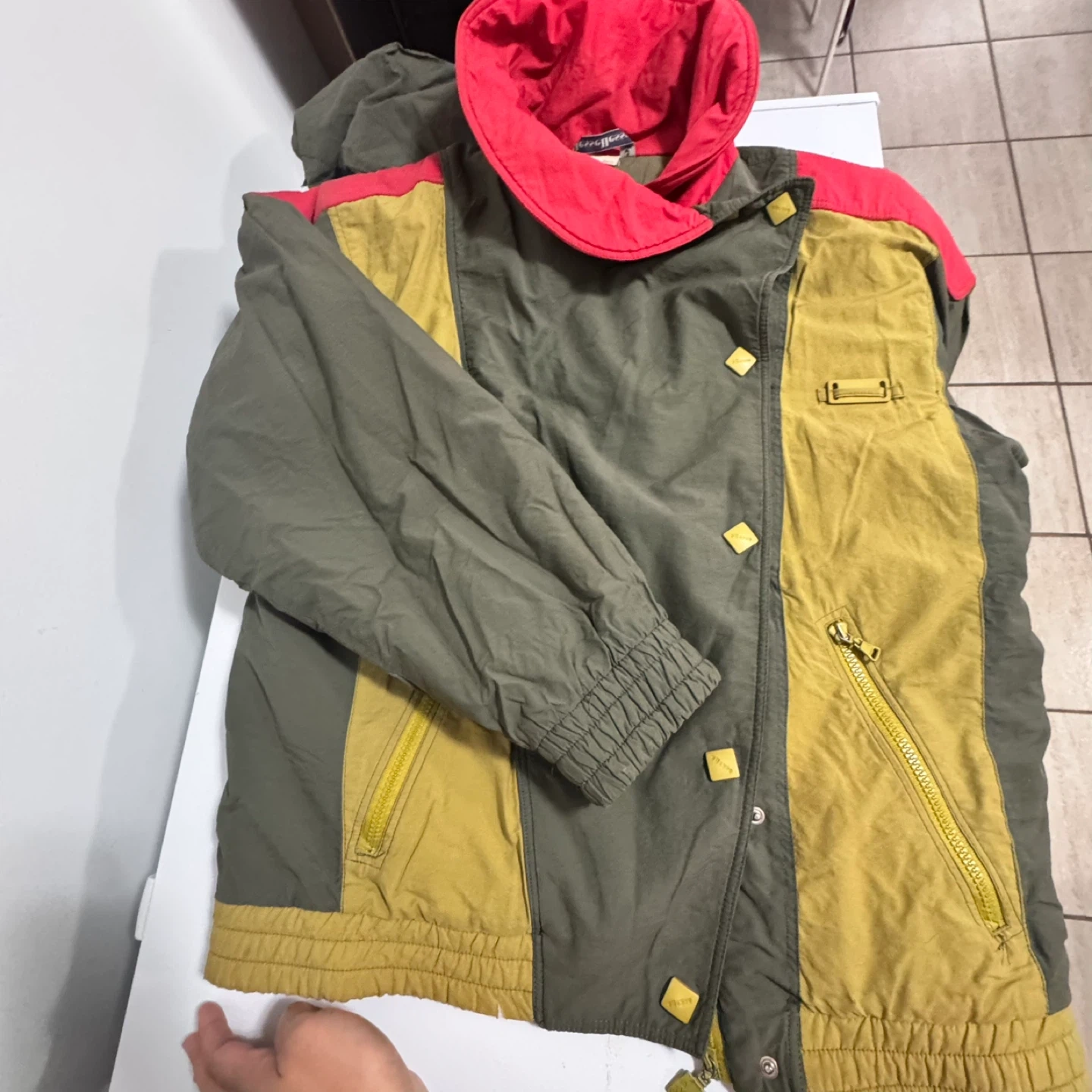 This vintage Ellesse ski jacket features a colour block design in olive green, mustard yellow, and red. It has a zip-up front with button closures and elasticated cuffs. The hood is integrated into the collar.
