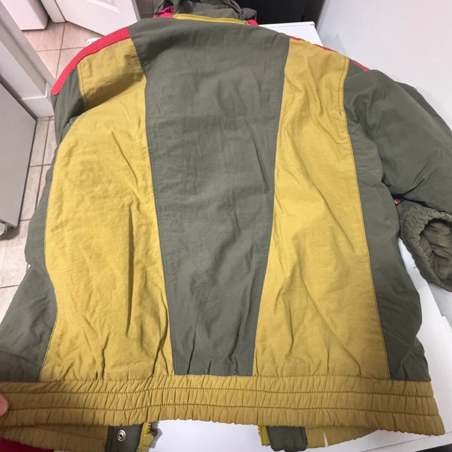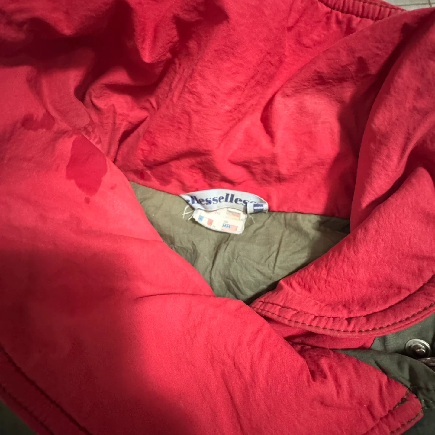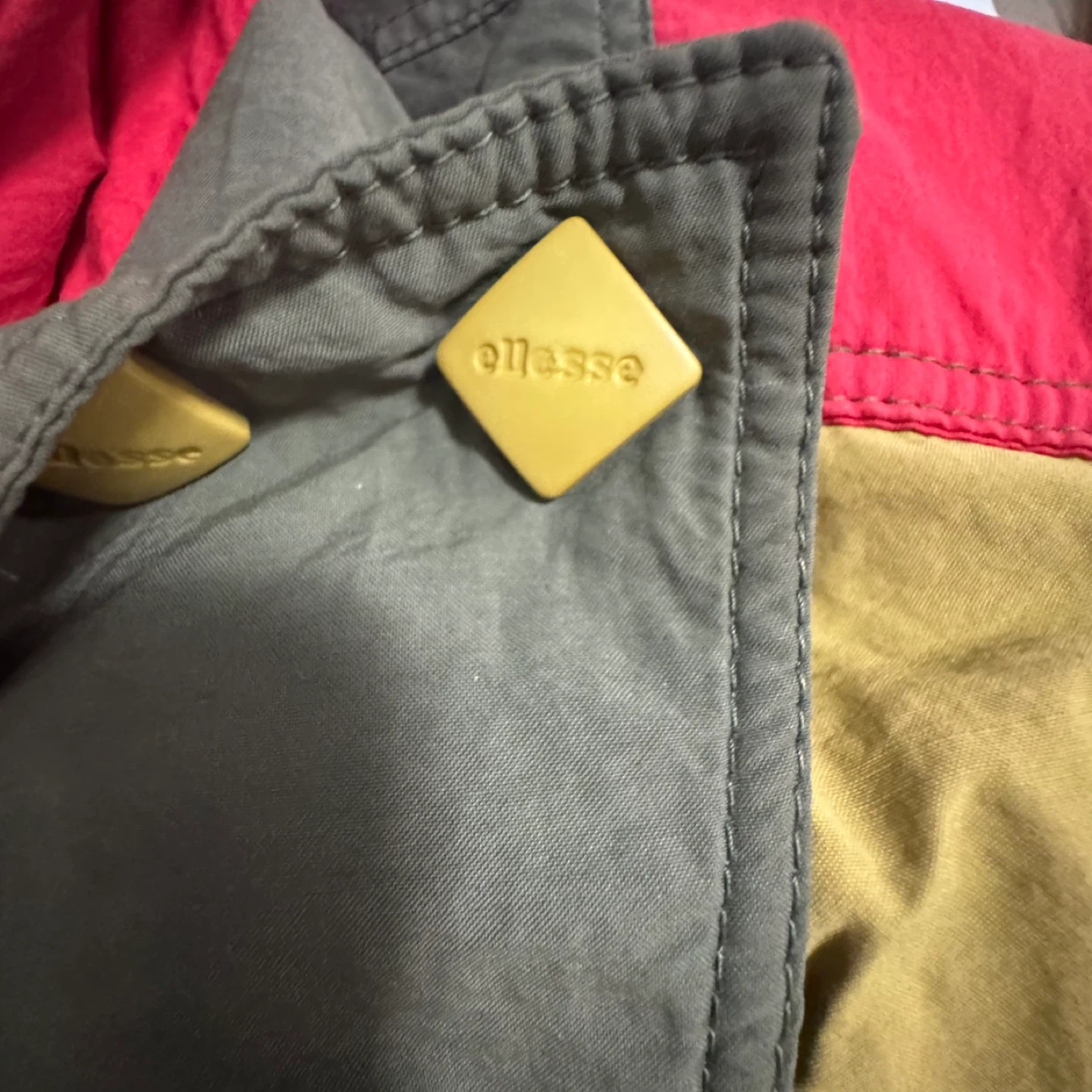 This vintage Ellesse ski jacket features a colour block design in olive green, mustard yellow, and red. It has a zip-up front with button closures and elasticated cuffs. The hood is integrated into the collar.
