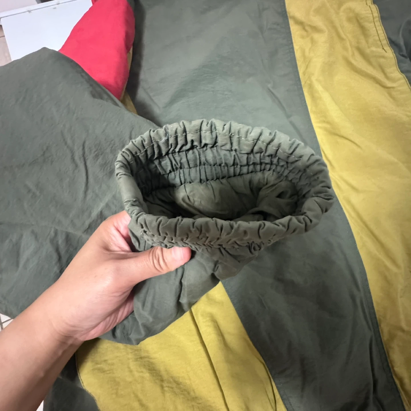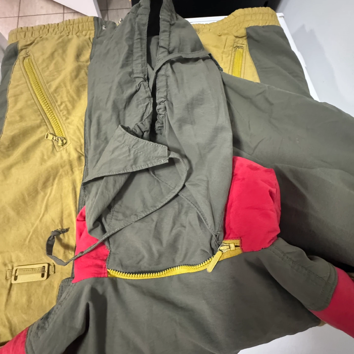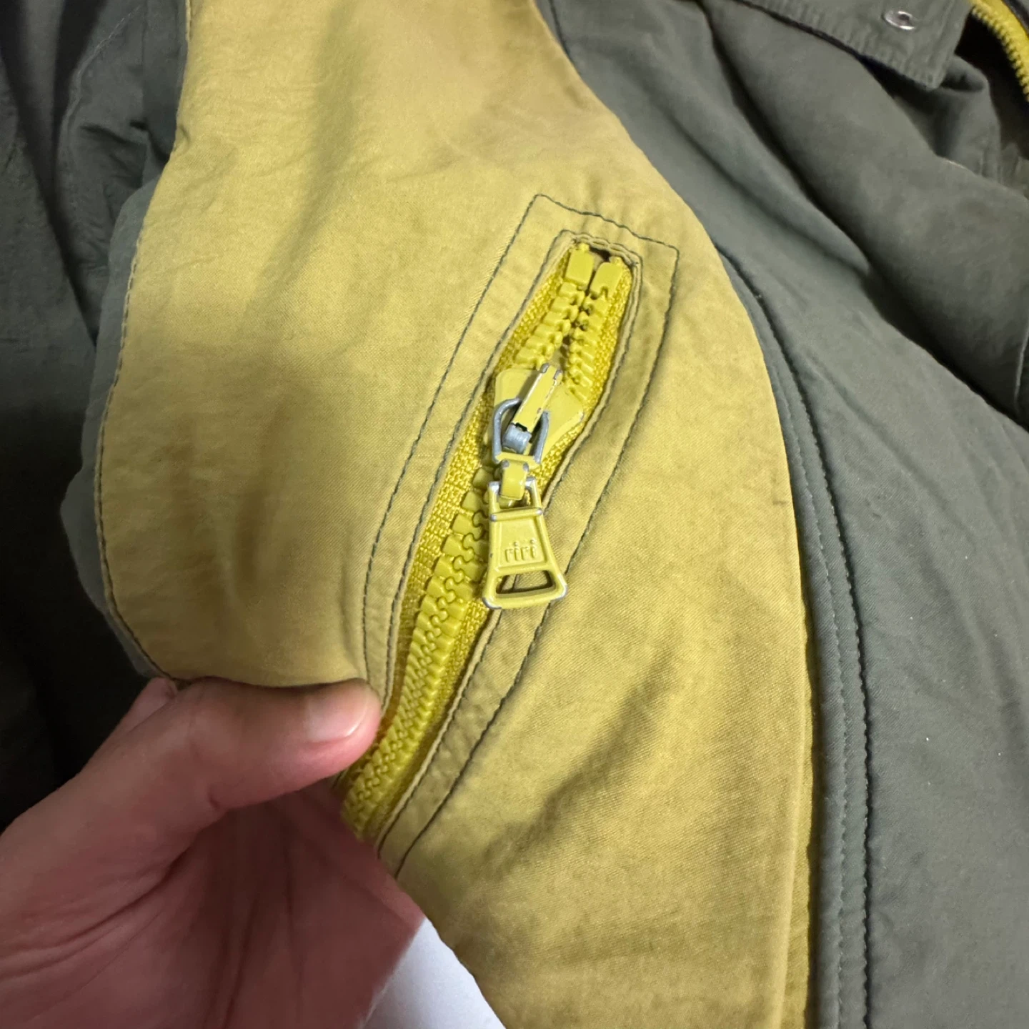 This vintage Ellesse ski jacket features a colour block design in olive green, mustard yellow, and red. It has a zip-up front with button closures and elasticated cuffs. The hood is integrated into the collar.