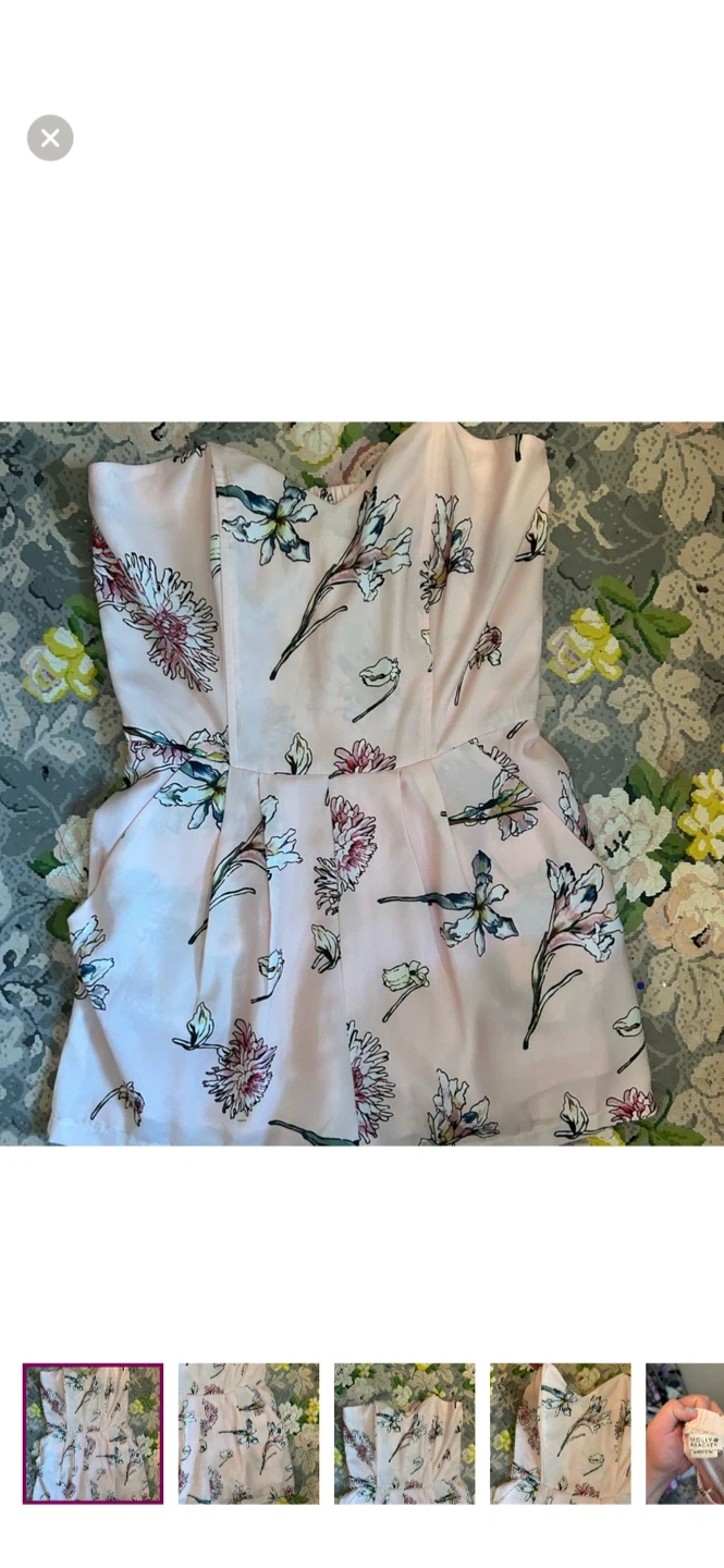 Molly bracken brand. Strapless shorts romper. Zipper back & pockets. Top is structured. Pink floral print. Size medium. Brand new condition