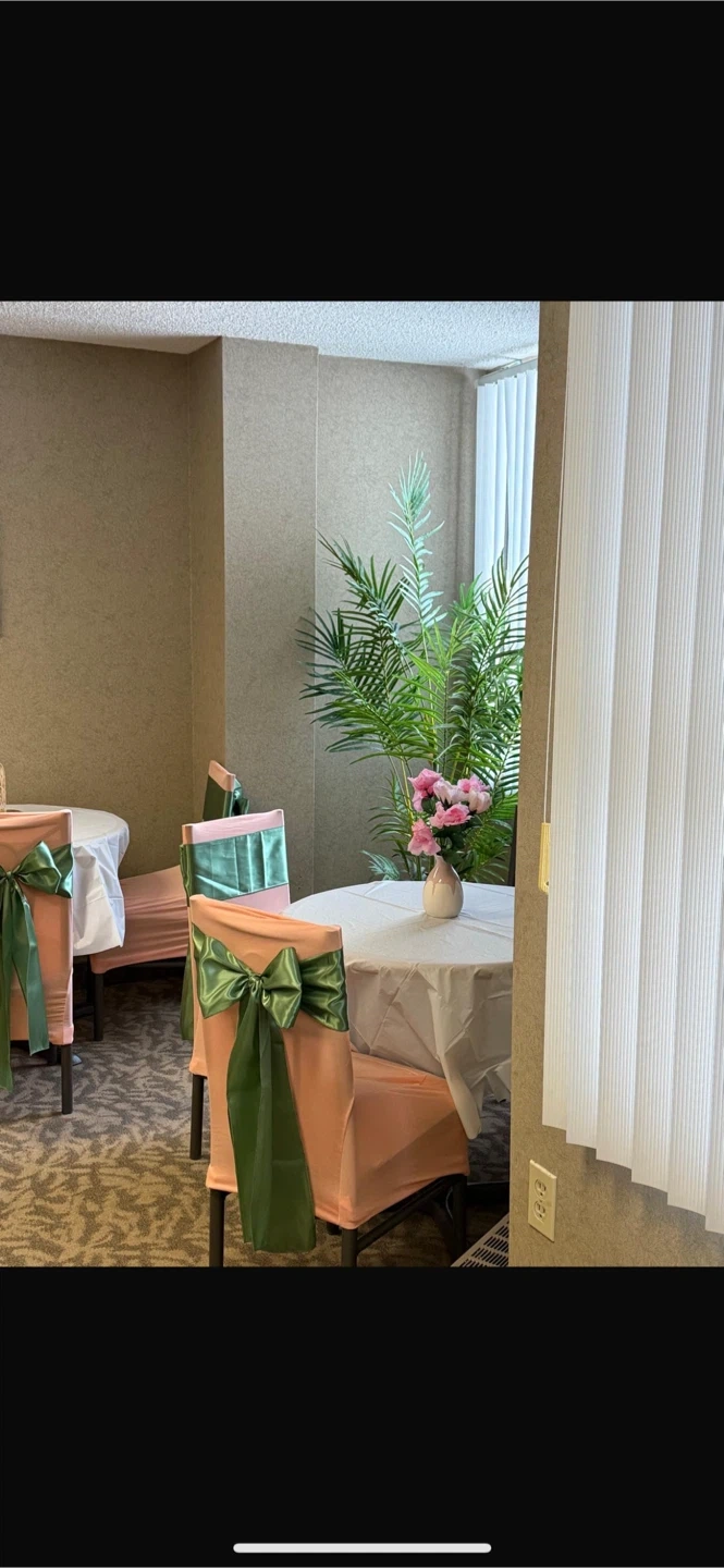 20 piece set of peach coloured chair covers. Great for weddings, parties, or any special occasion. They're designed to fit standard banquet chairs and are made of a stretchy fabric for easy application.